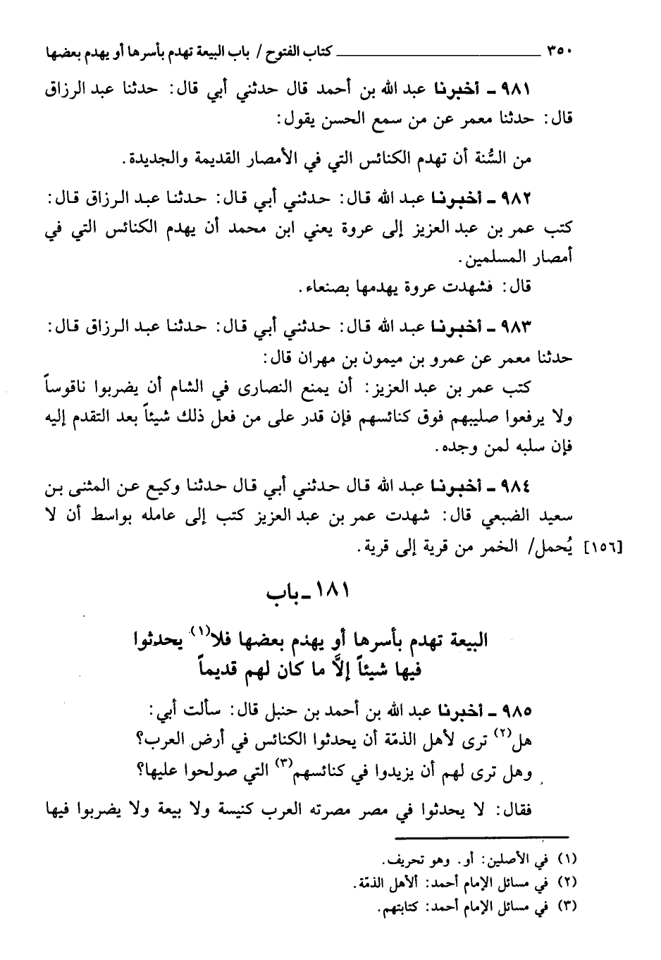 985 - أَخْبَرَنَا عبد الله بن أحمد بن حنبل، قَالَ: سألت أبي: هل ترى لأهل الذمة أن يحدثوا الكنائس فِي أرض العرب؟ وهل ترى لهم أن يزيدوا فِي كنائسهم الَّتِي صولحوا عَلَيْهَا؟ فَقَالَ: لا يحدثوا فِي مصر مصرته العرب كنيسة، ولا بيعة، ولا يضربوا فِيهَا