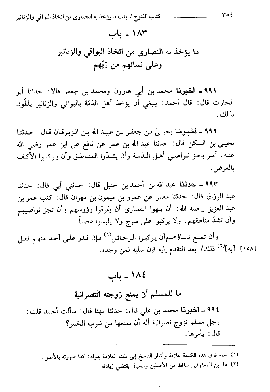 991 - أَخْبَرَنِي محمد بن أبي هارون، ومحمد بن جعفر، قَالا: حَدَّثَنَا أبو الحارث، قَالَ: قَالَ أحمد: ينبغي أن يؤخذ أهل الذمة بالبواقي والزنانير يذلون بذلك.