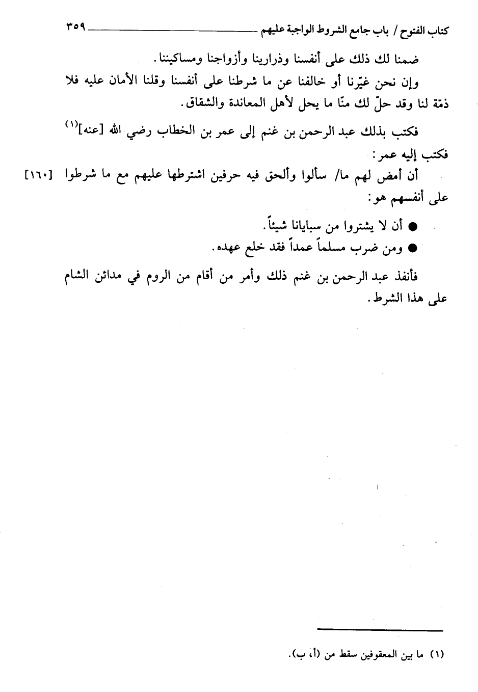 فَكَتَبَ بِذَلِكَ عَبْدُ الرَّحْمَنِ بْنُ غَنْمٍ إِلَى عُمَرَ بْنِ الْخَطَّابِ، رَضِيَ اللَّهُ عَنْهُ، فَكَتَبَ إِلَيْهِ عُمَرُ: أَنْ أَمْضِ لَهُمْ مَا سَأَلُوا، وَأَلْحِقْ فِيهِ حَرْفَيْنِ اشْتَرِطْهَا عَلَيْهِمْ مَعَ مَا شَرَطُوا عَلَى أَنْفُسِهِمْ: أَنْ لا يَشْتَرُوا مِنْ سَبَايَانَا شَيْئًا، وَمَنْ ضَرَبَ مُسْلِمًا عَمْدًا فَقَدَ خَلَعَ عَهْدَهُ.