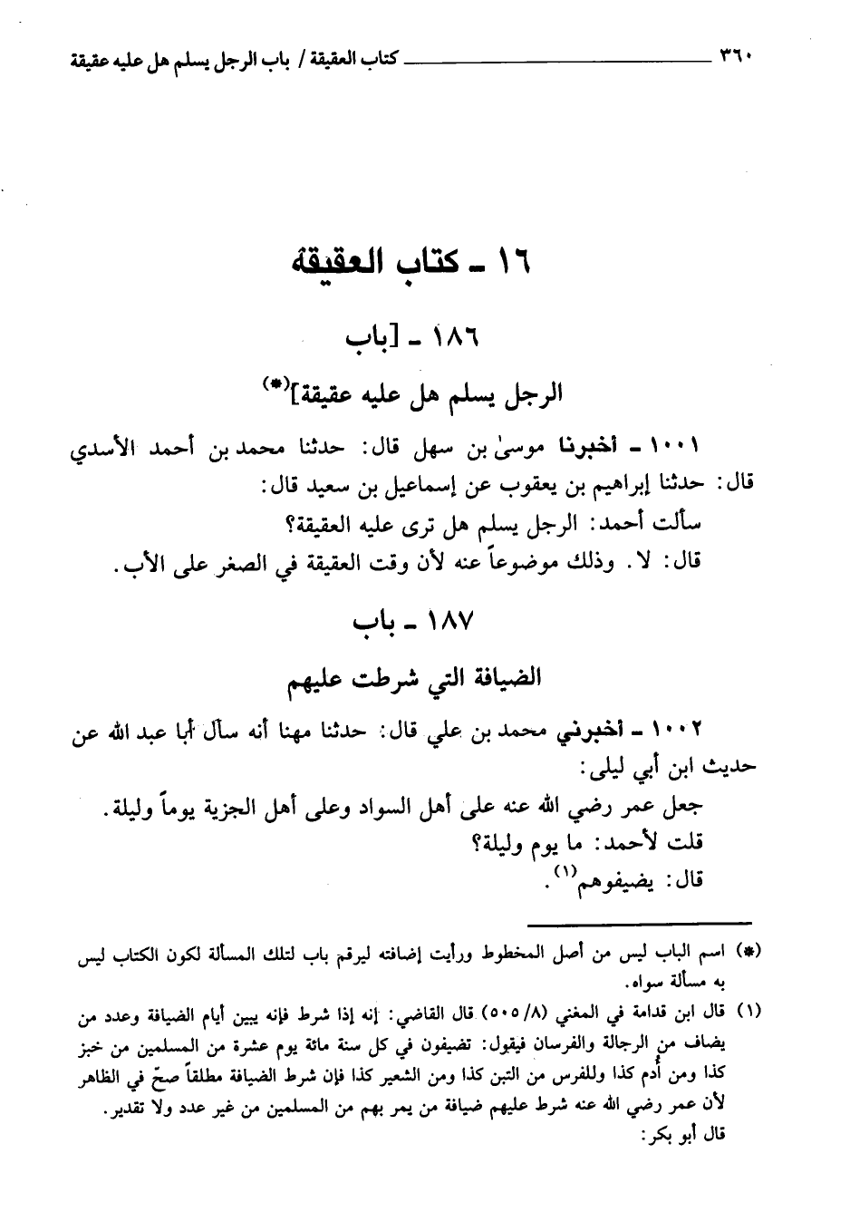1002 - أَخْبَرَنِي محمد بن علي، قَالَ: حَدَّثَنَا مهنا، أنه سأل أبا عبد الله عن حديث ابن أبي لَيْلَى: جعل عمر، رَضِيَ اللَّهُ عَنْهُ، عَلَى أهل السواد، وَعَلَى أهل الجزيرة يوما وليلة.