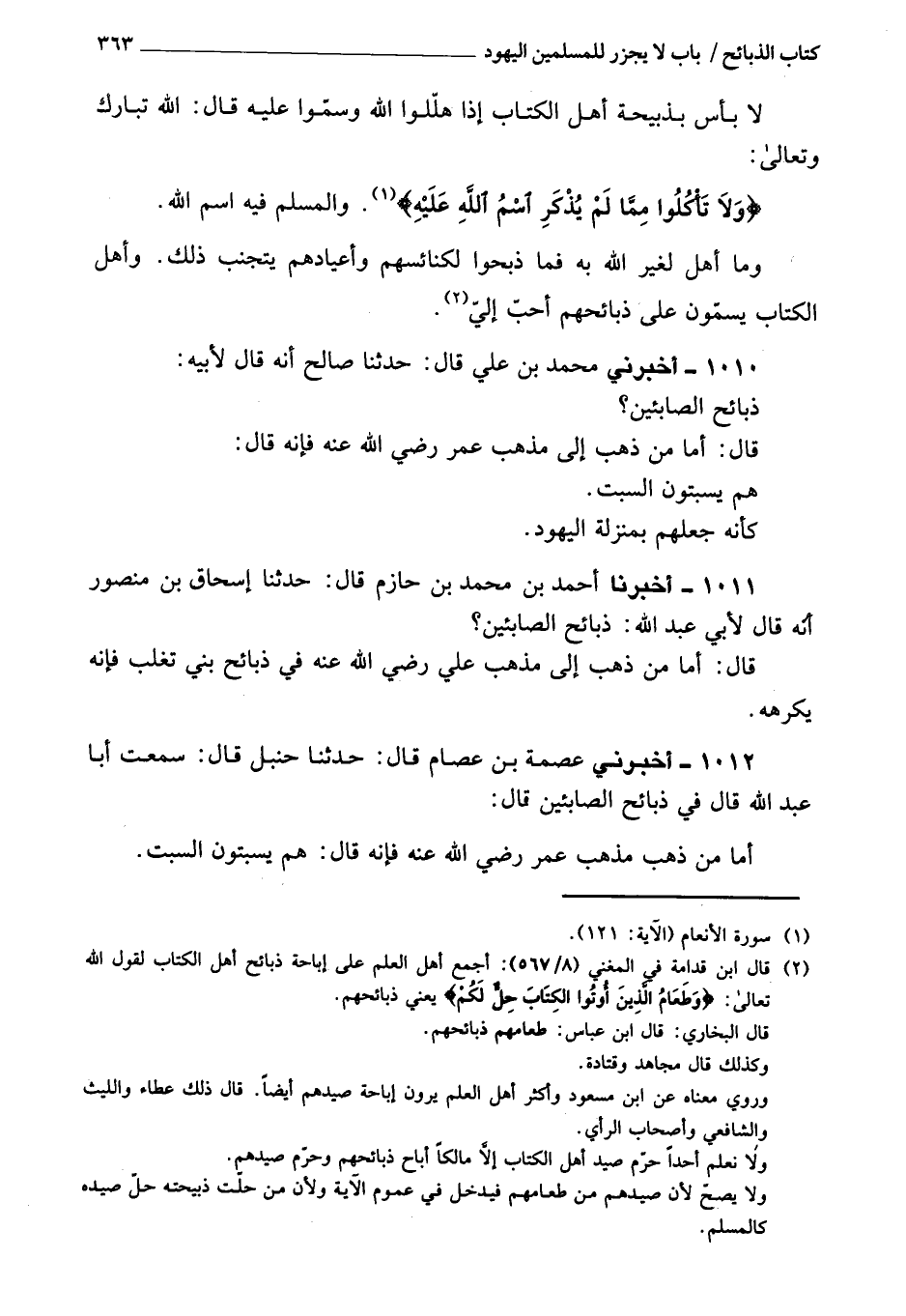 1012 - أَخْبَرَنِي عصمة بن عصام، قَالَ: حَدَّثَنَا حنبل، قَالَ: سمعت أبا عبد الله، قَالَ فِي ذبائح الصائبين، قَالَ: أما من ذهب إلى مذهب عمر، رَضِيَ اللَّهُ عَنْهُ، فإنه قَالَ: هم يسبتون السبت،
