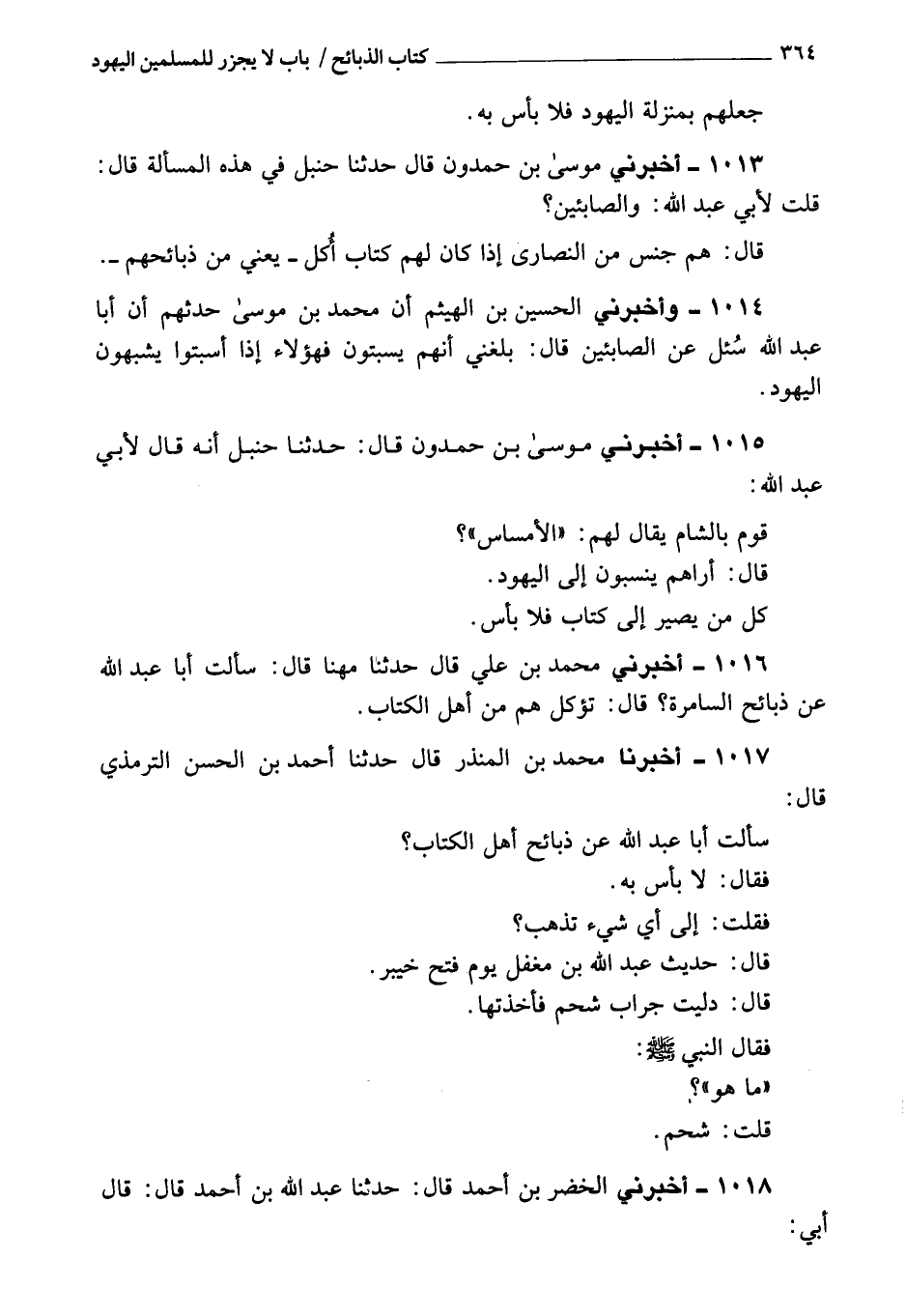 1017 - أَخْبَرَنَا مُحَمَّد بن المنذر، قَالَ: حَدَّثَنَا أحمد بن الحسن الترمذي، قَالَ: سألت أبا عبد الله عن ذبائح أهل الكتاب؟ فَقَالَ: لا بأس بِهِ.