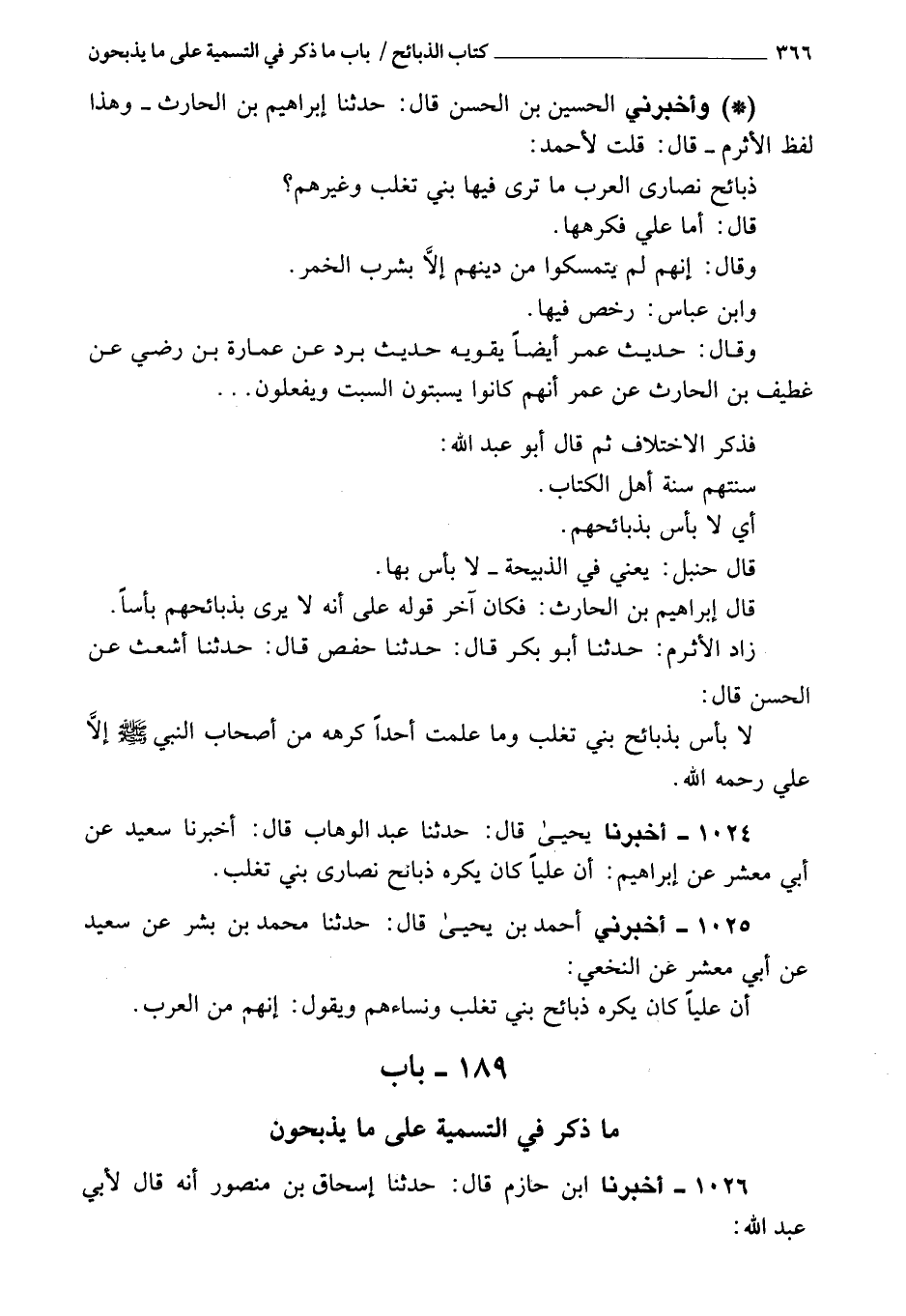 زاد الأثرم: حَدَّثَنَا حفص، قَالَ: حَدَّثَنَا أشعث، عن الحسن، قَالَ: لا بأس بذبائح بني تغلب، وما علمت أحدا كرهه من أصحاب النبي، صَلَّى اللَّهُ عَلَيْهِ وَسَلَّمَ، إلا علي، رحمه الله.