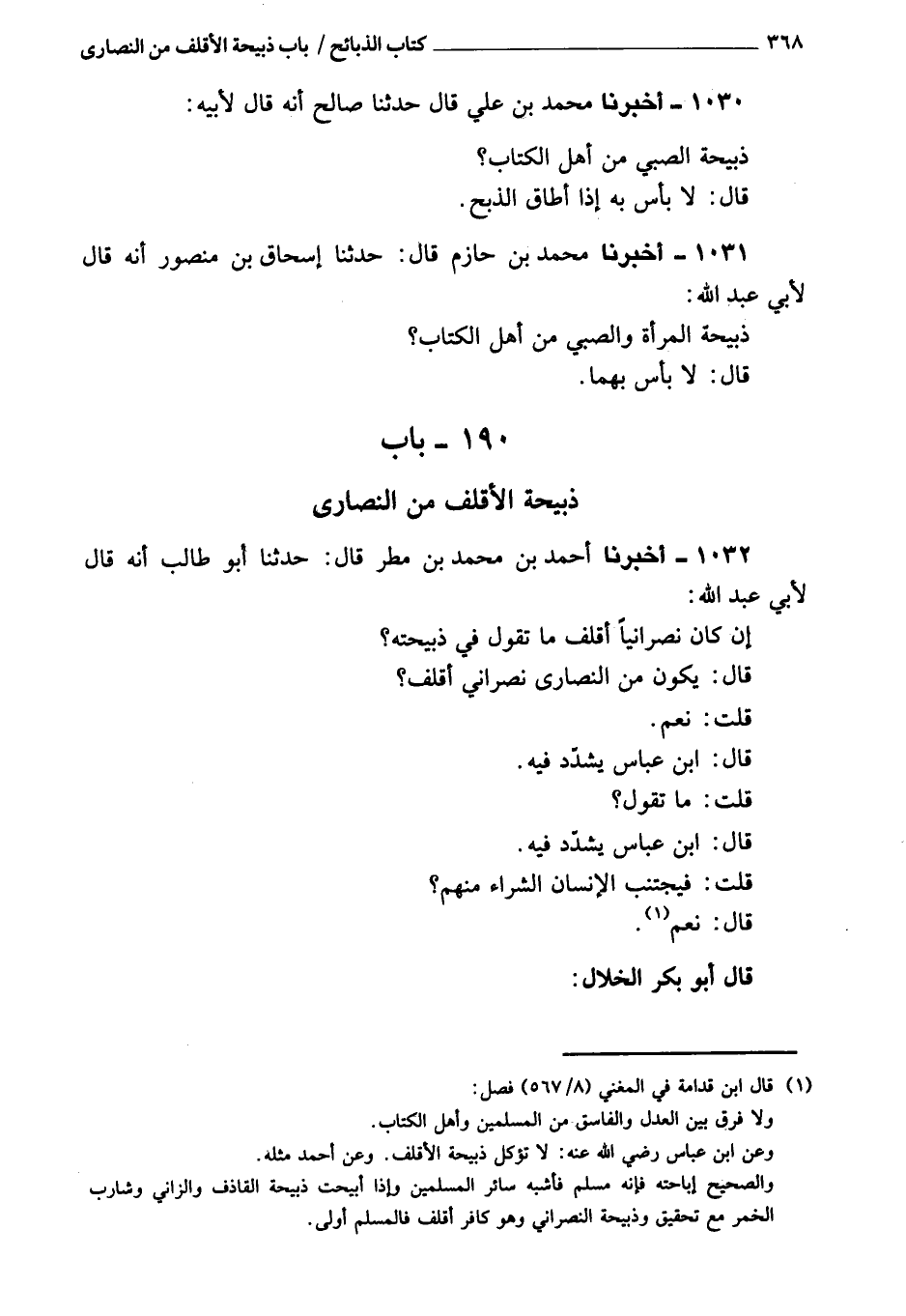 1032 - أَخْبَرَنَا أحمد بن مُحَمَّد بن مطر، قَالَ: حَدَّثَنَا أبو طالب، أنه قَالَ لأبي عبد الله: إن كان نصرانيا أقلف، ما تقول فِي ذبيحته؟ قَالَ: يكون من النصارى نصراني أقلف؟ قُلْتُ: نعم.