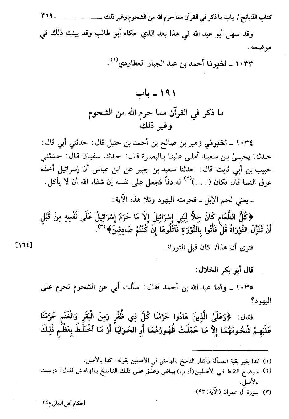 1035 - وأما عبد الله بن أحمد فَقَالَ: سألت أبي عن الشحوم تحرم عَلَى اليهود؟ فَقَالَ: {وَعَلَى الَّذِينَ هَادُوا حَرَّمْنَا كُلَّ ذِي ظُفُرٍ وَمِنَ الْبَقَرِ وَالْغَنَمِ حَرَّمْنَا عَلَيْهِمْ شُحُومَهُمَا إِلا مَا حَمَلَتْ ظُهُورُهُمَا أَوِ الْحَوَايَا أَوْ مَا اخْتَلَطَ بِعَظْمٍ ذَلِكَ