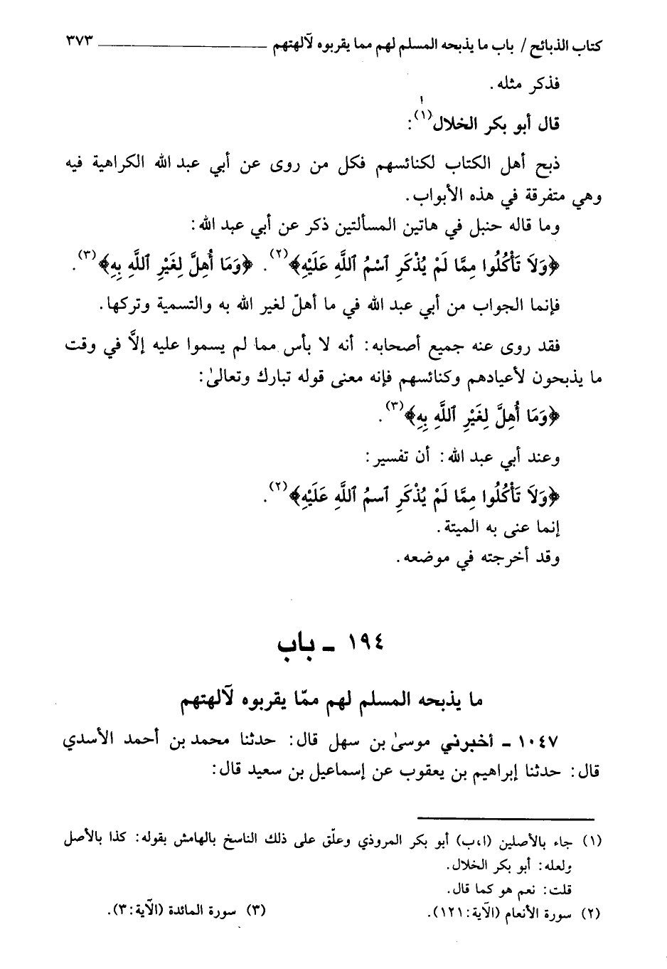وما قاله حنبل فِي هاتين المسألتين ذكر عن أبي عبد الله، ولا تأكلوا مما لم يذكر اسم الله عَلَيْهِ مما أهل لغير الله بِهِ، فإنما الجواب من أبي عبد الله فيما أهل لغير الله بِهِ، والتسمية وتركها.