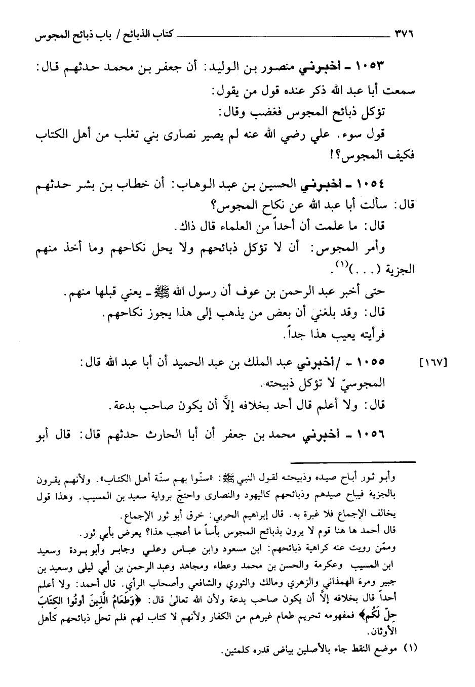 1054 - أَخْبَرَنِي الحسن بن عبد الوهاب، أن خطاب بن بشر حدثهم، قَالَ: سألت أبا عبد الله عن نكاح المجوسي؟ قَالَ: ما علمت أن أحدا من العلماء قَالَ ذلك، وأمر المجوس أن لا تؤكل ذبائحهم، ولا يحل نكاحهم، وما أخذ مِنْهُ م الجزية حتى أخبر عبد الرحمن بن عوف أن رسول الله، صَلَّى اللَّهُ عَلَيْهِ وَسَلَّمَ، قبلها مِنْهُم، قَالَ: وقد بَلَغَنِي أن بعض من يذهب إلى هذا، يعني: يجوز نكاحهم، فرأيته يعيب هذا جدا.