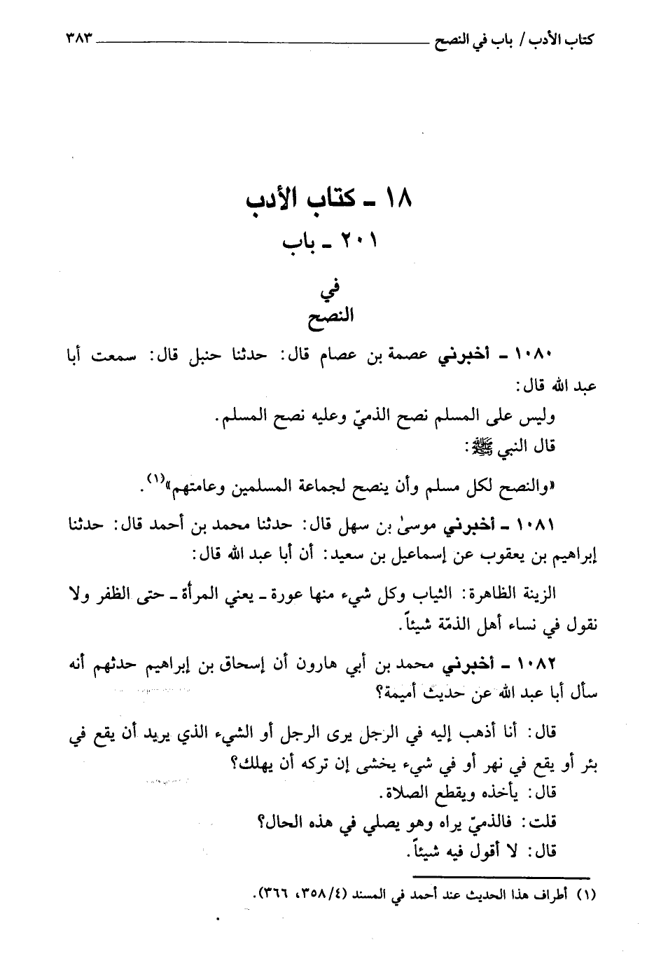 1080 - أَخْبَرَنِي عصمة بن عصام، قَالَ: حَدَّثَنَا حنبل، قَالَ: سمعت أبا عبد الله، قَالَ: وليس عَلَى المسلم نصح الذمي، وَعَلَيْهِ نصح المسلم، قَالَ: النبي، صَلَّى اللَّهُ عَلَيْهِ وَسَلَّمَ: «والنصح لكل مسلم» وأن «ينصح لجماعة المسلمين وعامتهم» .
