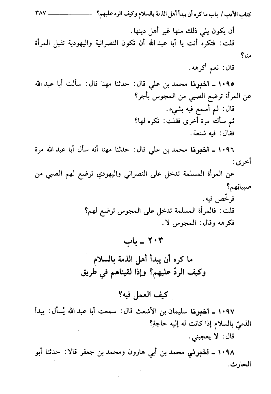 1097 - أَخْبَرَنَا سليمان بن الأشعث، قَالَ: سمعت أبا عبد الله يسأل؛ يبدأ الذمي بالسلام إذا كانت له إليه حاجة؟ قَالَ: لا يعجبني.