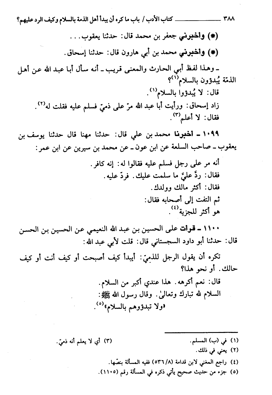 1100 - قرأت عَلَى الحسين بن عبد الله النعيمي، عن الحسين بن الحسن، قَالَ: حَدَّثَنَا أبو داود السجستاني، قَالَ: قلت لأبي عبد الله: تكره أن يقول الرجل للذمي يبدأ: كيف أصبحت، أو كيف أنت، أو كيف حالك، أو نحو هذا؟ قَالَ: نعم أكرهه، هذا عندي أكبر من السلام.