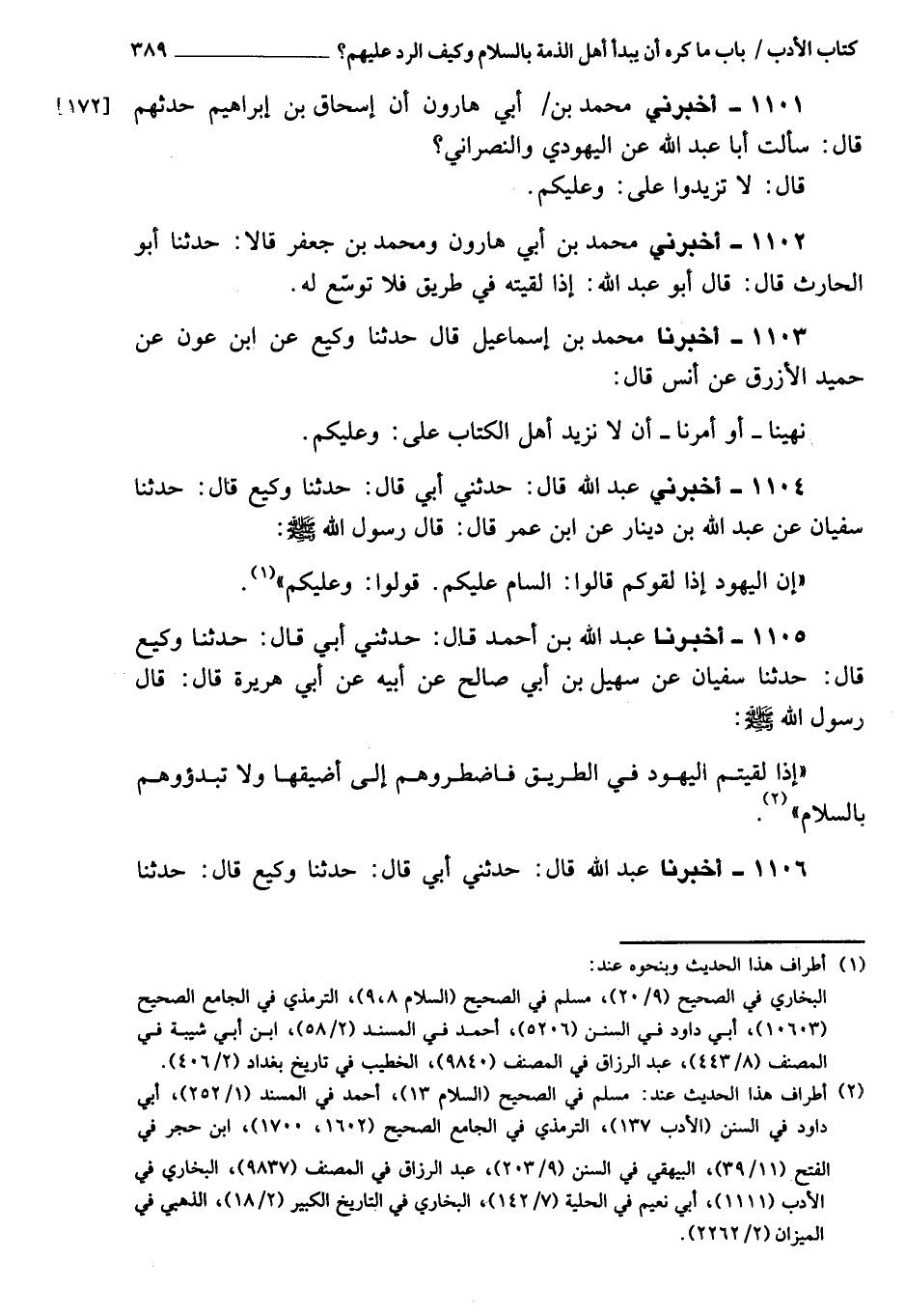 1105 - أَخْبَرَنَا عَبْدُ اللَّهِ بْنُ أَحْمَدَ، قَالَ: حَدَّثَنِي أَبِي، قَالَ: حَدَّثَنَا وَكِيعٌ، قَالَ: حَدَّثَنَا سُفْيَانُ، عَنْ سُهَيْلِ بْنِ أَبِي صَالِحٍ، عَنْ أَبِيهِ، عَنْ أَبِي هُرَيْرَةَ، قَالَ: قَالَ رَسُولُ اللَّهِ، صَلَّى اللَّهُ عَلَيْهِ وَسَلَّمَ: «إِذَا لَقِيتُمُ الْيَهُودَ فِي الطَّرِيقِ فَاضْطَرُّوهُمْ إِلَى أَضْيَقِهَا، وَلا تَبْدَءُوهُمْ بِالسَّلامِ»