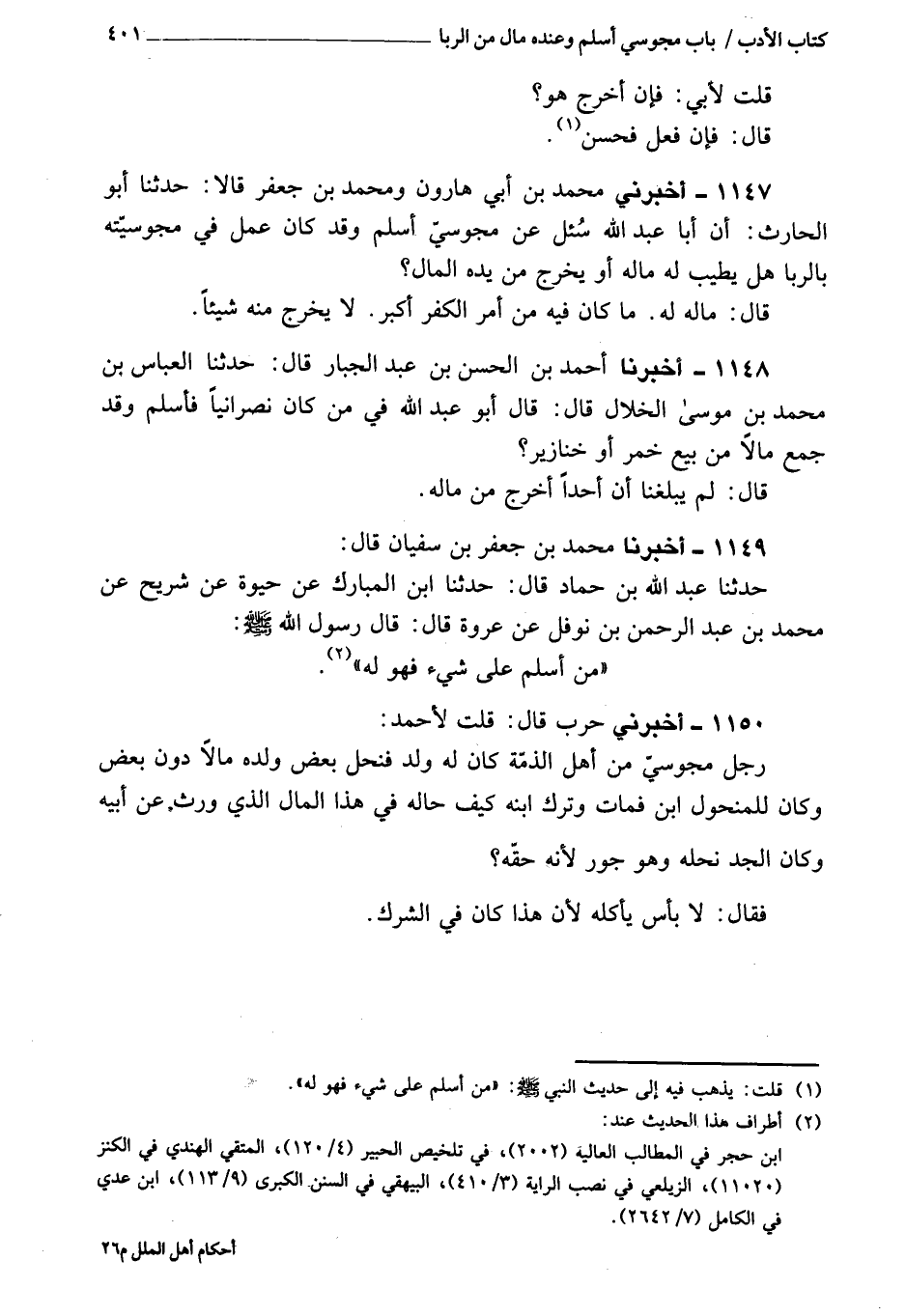 1147 - أَخْبَرَنِي محمد بن أبي هارون، ومحمد بن جعفر، قَالا: حَدَّثَنَا أبو الحارث، أن أبا عبد الله سئل عن مجوسي أسلم، وقد كان عمل فِي مجوسيته بالرباء: هل يطيب له ماله، أو يخرج من يده المال؟ قَالَ: ماله له، ما كان فِيهِ من الكفر أكبر، ولا يخرج مِنْهُ شيئا.