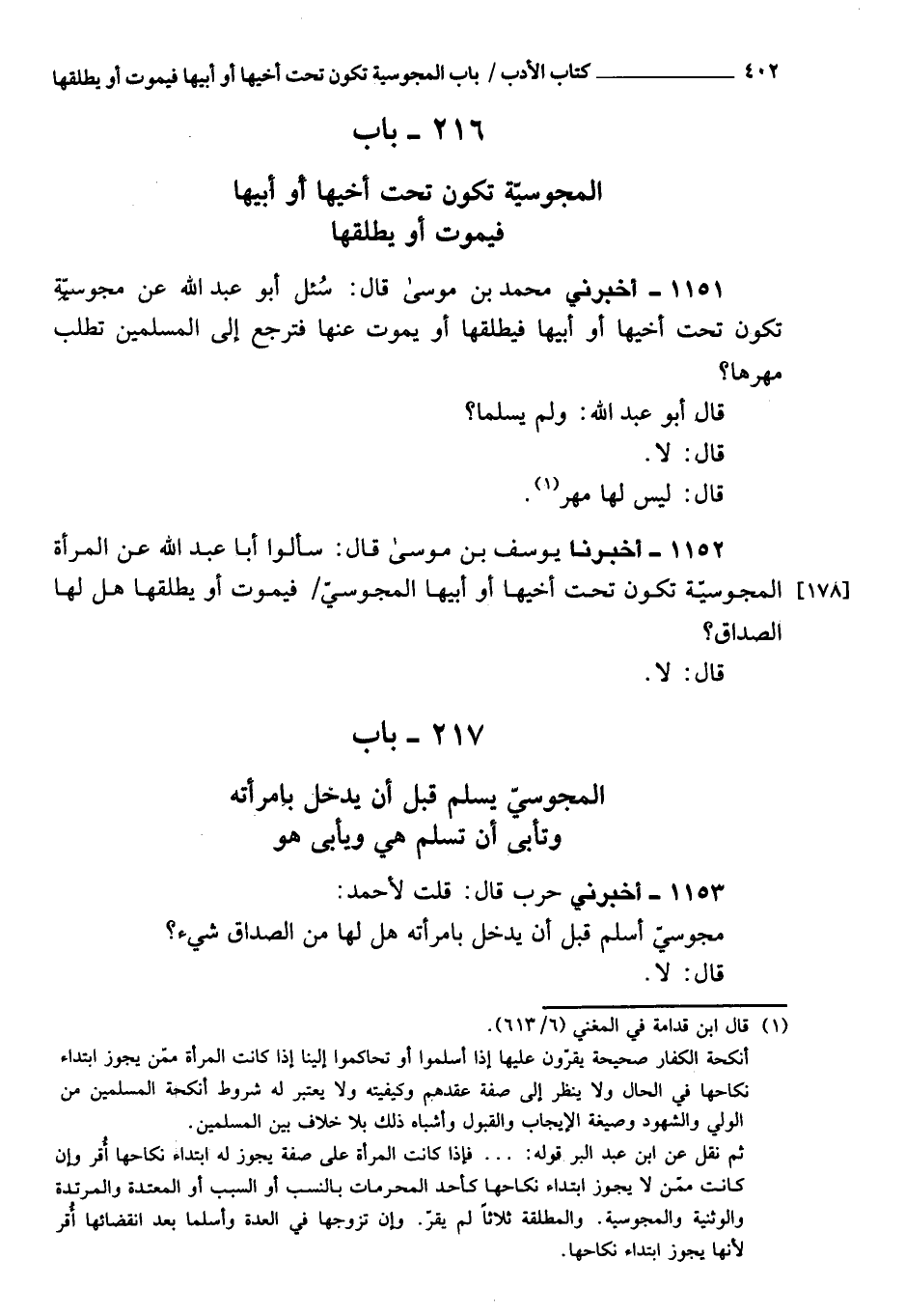 1152 - أَخْبَرَنِي يوسف بن مُوسَى، قَالَ: سألوا أبا عبد الله: المرأة المجوسية تكون تحت أخيها، أو أبيها المجوسي فيموت، أو يطلقها، هل لها الصداق؟ قَالَ: لا.
