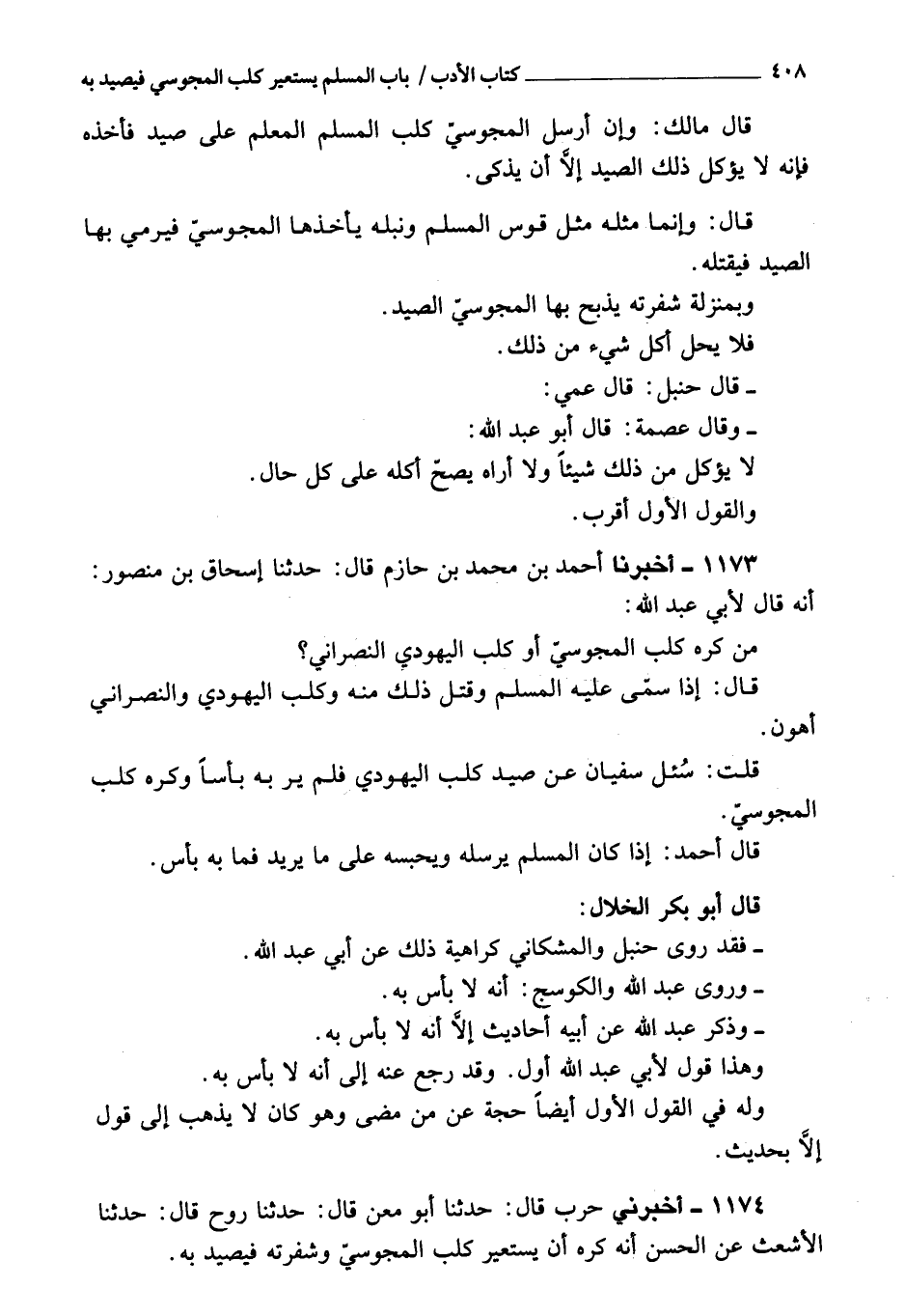1173 - أَخْبَرَنَا أحمد بن مُحَمَّد بن حازم، قَالَ: حَدَّثَنَا إسحاق بن منصور، أنه قَالَ لأبي عبد الله: من كره كلب المجوسي، أو كلب اليهودي والنصراني؟ قَالَ: إذا سمى عَلَيْهِ المسلم، وقتل ذاك فِيهِ، وكلب اليهودي والنصراني فأهون.