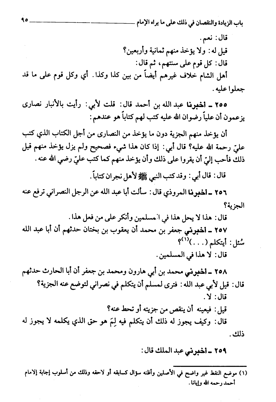 258 - أَخْبَرَنِي محمد بن أبي هارون، ومحمد بن جعفر، أن أبا الحارث حدثهم، قَالَ: قيل لأبي عبد الله: فترى لمسلم أن يتكلم في نصراني أن توضع عنه الجزية؟ قَالَ: لا، قيل فيعينه أن ينقص من جزيته أو يحط عنه؟ قَالَ: وكيف يجوز له ذلك أن يتكلم فيه، لم؟ هو حق الذي يكلمه؟ لا يجوز له ذلك