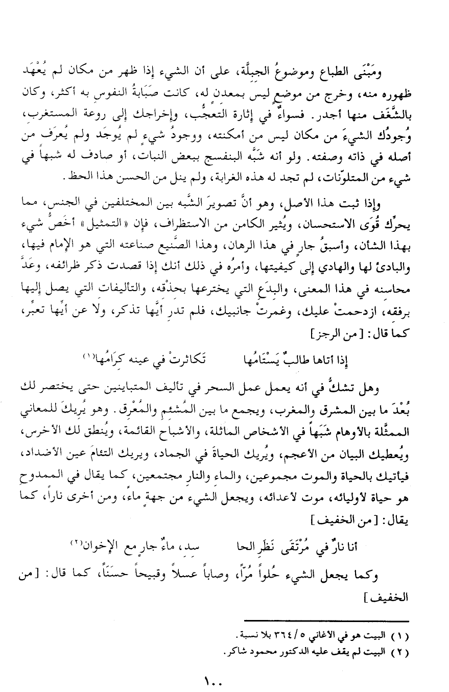 وهل تشكّ في أنه يعمل عمل السحر في تأليف المتباينين حتى يختصر لك بعد ما بين المشرق والمغرب، ويجمع ما بين المشئم والمعرق. وهو يريك للمعاني الممثّلة بالأوهام شبها في الأشخاص الماثلة، والأشباح القائمة، وينطق لك الأخرس، ويعطيك البيان من الأعجم، ويريك الحياة في الجماد، ويريك التئام عين الأضداد، فيأتيك بالحياة والموت مجموعين، والماء والنار مجتمعين، كما يقال في الممدوح هو حياة لأوليائه، موت لأعدائه، ويجعل الشيء من جهة ماء، ومن أخرى نارا، كما يقال: [من الخفيف]