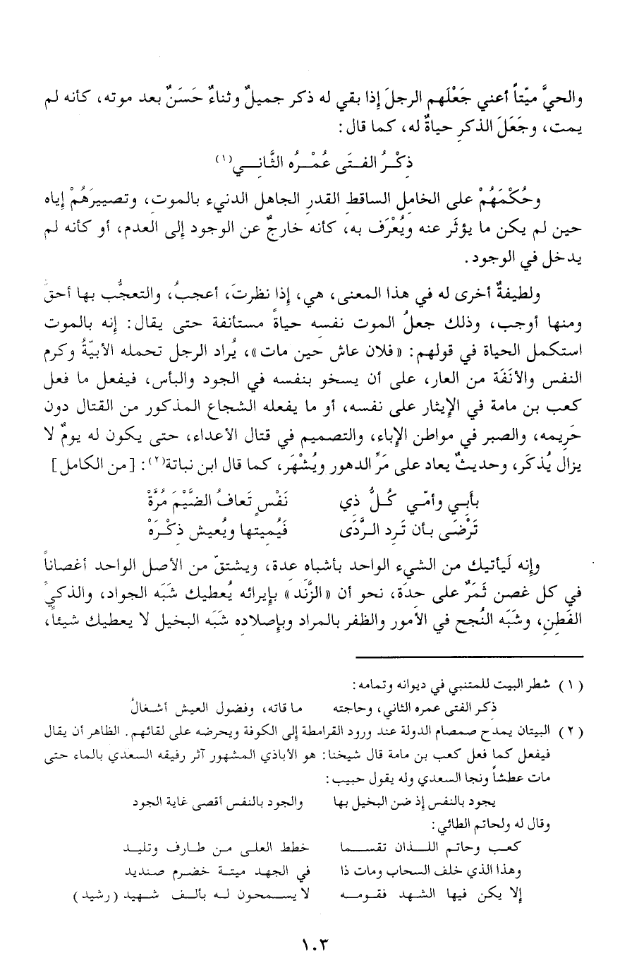 ولطيفة أخرى له في هذا المعنى، هي، إذا نظرت، أعجب، والتعجّب بها أحقّ ومنها أوجب، وذلك جعل الموت نفسه حياة مستأنفة حتى يقال: إنه بالموت استكمل الحياة في قولهم: «فلان عاش حين مات»، يراد الرجل تحمله الأبيّة وكرم النفس والأنفة من العار، على أن يسخو بنفسه في الجود والبأس، فيفعل ما فعل كعب بن مامة في الإيثار على نفسه، أو ما يفعله الشجاع المذكور من القتال دون حريمه، والصبر في مواطن الإباء، والتصميم في قتال الأعداء، حتى يكون له يوم لا يزال يذكر، وحديث يعاد على مرّ الدهور ويشهر، كما قال ابن نباتة (¬2): [من الكامل]