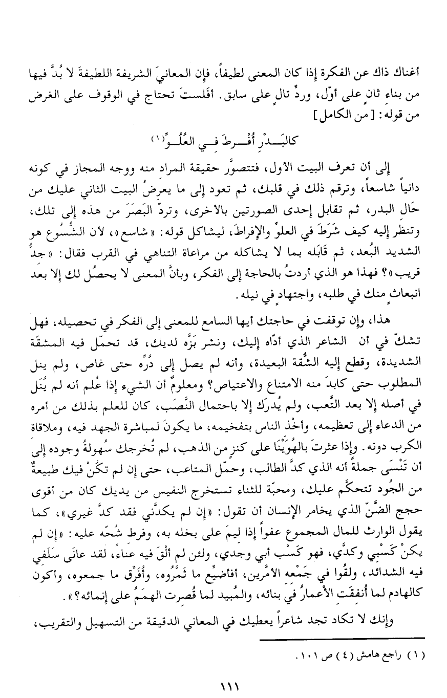 أغناك ذاك عن الفكرة إذا كان المعنى لطيفا، فإن المعاني الشريفة اللطيفة لا بدّ فيها من بناء ثان على أوّل، وردّ تال على سابق. أفلست تحتاج في الوقوف على الغرض من قوله: [من الكامل] كالبدر أفرط في العلوّ (¬1) إلى أن تعرف البيت الأول، فتتصوّر حقيقة المراد منه ووجه المجاز في كونه دانيا شاسعا، وترقم ذلك في قلبك، ثم تعود إلى ما يعرض البيت الثاني عليك من حال البدر، ثم تقابل إحدى الصورتين بالأخرى، وتردّ البصر من هذه إلى تلك، وتنظر إليه كيف شرط في العلوّ والإفراط، ليشاكل قوله: «شاسع»، لأن الشّسوع هو الشديد البعد، ثم قابله بما لا يشاكله من مراعاة التناهي في القرب فقال: «جدّ قريب»؟ فهذا هو الذي أردت بالحاجة إلى الفكر، وبأنّ المعنى لا يحصل لك إلا بعد انبعاث منك في طلبه، واجتهاد في نيله.