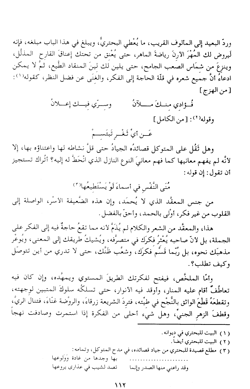 وردّ البعيد إلى المألوف القريب، ما يعطي البحتريّ، ويبلغ في هذا الباب مبلغه، فإنه ليروض لك المهر الأرن رياضة الماهر، حتى يعنق من تحتك إعناق القارح المذلّل، وينزع من شماس الصعب الجامح، حتى يلين لك لين المنقاد الطّيع، ثمّ لا يمكن ادعاء أنّ جميع شعره في قلّة الحاجة إلى الفكر، والغنى عن فضل النظر، كقوله (¬1):