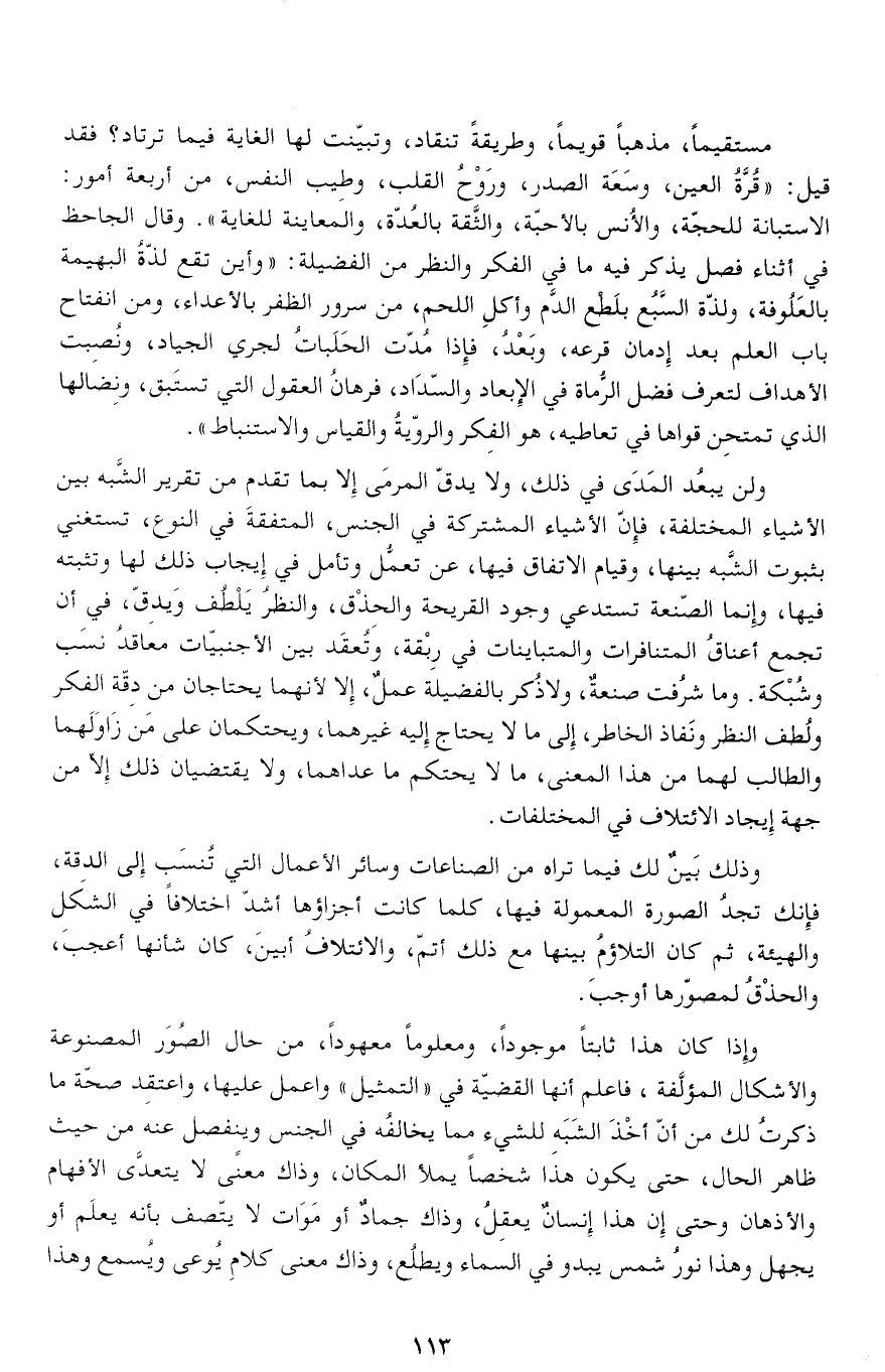 ولن يبعد المدى في ذلك، ولا يدقّ المرمى إلا بما تقدم من تقرير الشّبه بين الأشياء المختلفة، فإنّ الأشياء المشتركة في الجنس، المتفقة في النوع، تستغني بثبوت الشّبه بينها، وقيام الاتفاق فيها، عن تعمّل وتأمل في إيجاب ذلك لها وتثبته فيها، وإنما الصّنعة تستدعي وجود القريحة والحذق، والنظر يلطف ويدقّ، في أن تجمع أعناق المتنافرات والمتباينات في ربقة، وتعقد بين الأجنبيّات معاقد نسب وشبكة. وما شرفت صنعة، ولا ذكر بالفضيلة عمل، إلا لأنهما يحتاجان من دقّة الفكر ولطف النظر ونفاذ الخاطر، إلى ما لا يحتاج إليه غيرهما، ويحتكمان على من زاولهما والطالب لهما من هذا المعنى، ما لا يحتكم ما عداهما، ولا يقتضيان ذلك إلّا من جهة إيجاد الائتلاف في المختلفات.