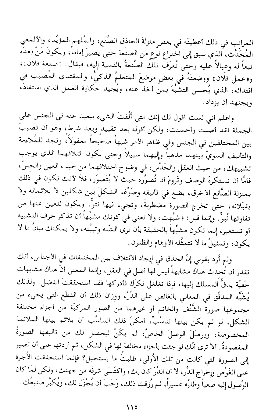 ولم أرد بقولي إنّ الحذق في إيجاد الائتلاف بين المختلفات في الأجناس، أنك تقدر أن تحدث هناك مشابهة ليس لها أصل في العقل، وإنما المعنى أنّ هناك مشابهات خفيّة يدقّ المسلك إليها، فإذا تغلغل فكرك فأدركها فقد استحققت الفضل. ولذلك يشبّه المدقّق في المعاني بالغائص على الدرّ، ووزان ذلك أن القطع التي يجيء من مجموعها صورة الشّنف والخاتم أو غيرهما من الصور المركّبة من أجزاء مختلفة الشكل، لو لم يكن بينها تناسب، أمكن ذلك التناسب أن يلائم بينها الملائمة المخصوصة، ويوصل الوصل الخاصّ، لم يكن ليحصل لك من تأليفها الصورة المقصودة. ألا ترى أنّك لو جئت بأجزاء مخالفة لها في الشكل، ثم أردتها على أن تصير إلى الصورة التي كانت من تلك الأولى، طلبت ما يستحيل؟ فإنما استحققت الأجرة على الغوص وإخراج الدّر، لا أن الدرّ كان بك، واكتسى شرفه من جهتك، ولكن لمّا كان الوصول إليه صعبا وطلبه عسيرا، ثم رزقت ذلك، وجب أن يجزل لك، ويكبّر صنيعك.