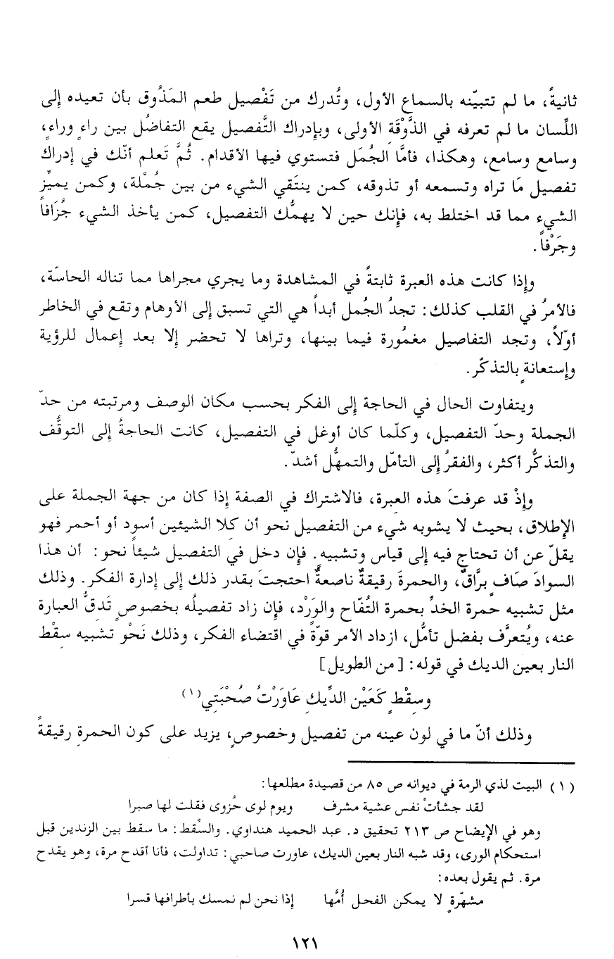 ثانية، ما لم تتبيّنه بالسماع الأول، وتدرك من تفصيل طعم المذوق بأن تعيده إلى اللّسان ما لم تعرفه في الذّوقة الأولى، وبإدراك التّفصيل يقع التفاضل بين راء وراء، وسامع وسامع، وهكذا، فأمّا الجمل فتستوي فيها الأقدام. ثمّ تعلم أنّك في إدراك تفصيل ما تراه وتسمعه أو تذوقه، كمن ينتقي الشيء من بين جملة، وكمن يميّز الشيء مما قد اختلط به، فإنك حين لا يهمّك التفصيل، كمن يأخذ الشيء جزافا وجرفا.