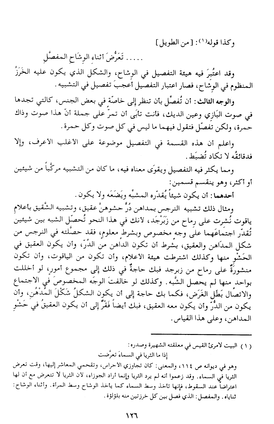 وكذا قوله (¬1): [من الطويل] ..... تعرّض أثناء الوشاح المفصّل وقد اعتبر فيه هيئة التفصيل في الوشاح، والشكل الذي يكون عليه الخرز المنظوم في الوشاح، فصار اعتبار التفصيل أعجب تفصيل في التشبيه.