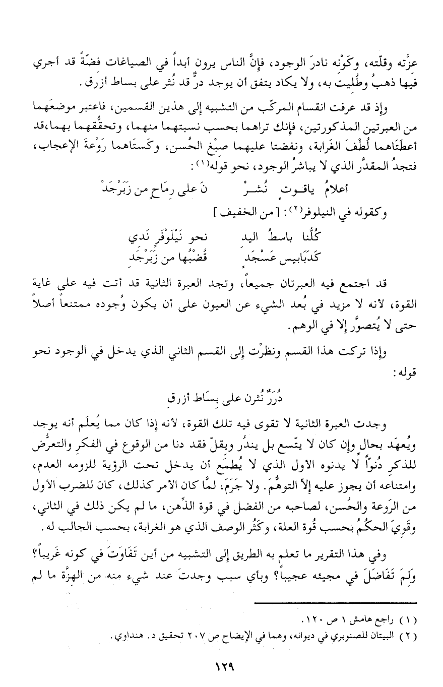 درر نثرن على بساط أزرق وجدت العبرة الثانية لا تقوى فيه تلك القوة، لأنه إذا كان مما يعلم أنه يوجد ويعهد بحال وإن كان لا يتّسع بل يندر ويقلّ فقد دنا من الوقوع في الفكر والتعرّض للذكر دنوّا لا يدنوه الأول الذي لا يطمع أن يدخل تحت الرؤية للزومه العدم، وامتناعه أن يجوز عليه إلّا التوهّم. ولا جرم، لمّا كان الأمر كذلك، كان للضرب الأول من الروعة والحسن، لصاحبه من الفضل في قوة الذّهن، ما لم يكن ذلك في الثاني، وقوي الحكم بحسب قوة العلة، وكثر الوصف الذي هو الغرابة، بحسب الجالب له.