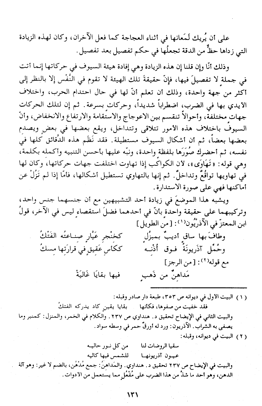وذلك أنّا وإن قلنا إن هذه الزيادة وهي إفادة هيئة السيوف في حركاتها إنما أتت في جملة لا تفصيل فيها، فإنّ حقيقة تلك الهيئة لا تقوم في النّفس إلا بالنظر إلى أكثر من جهة واحدة، وذلك أن تعلم أنّ لها في حال احتدام الحرب، واختلاف الأيدي بها في الضرب، اضطرابا شديدا، وحركات بسرعة. ثم إن لتلك الحركات جهات مختلفة،