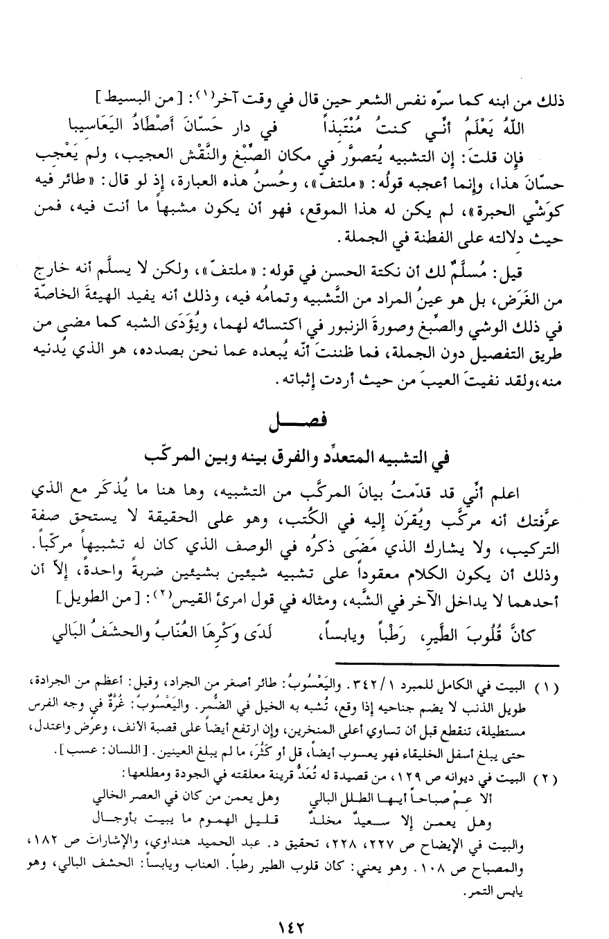 اعلم أنّي قد قدّمت بيان المركّب من التشبيه، وهاهنا ما يذكر مع الذي عرّفتك أنه مركّب ويقرن إليه في الكتب، وهو على الحقيقة لا يستحق صفة التركيب، ولا يشارك الذي مضى ذكره في الوصف الذي كان له تشبيها مركّبا.