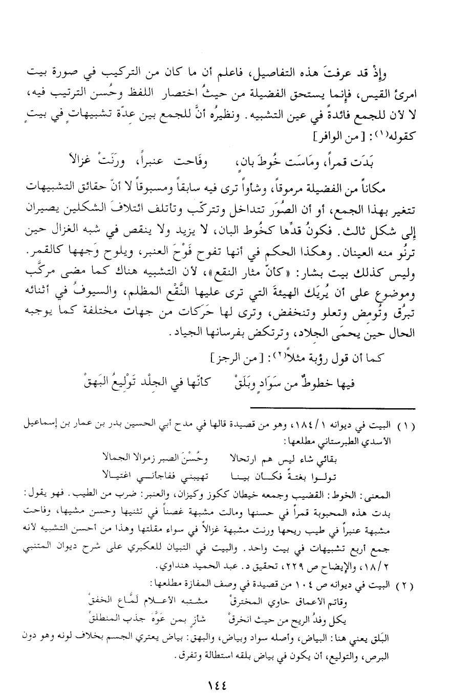 مكانا من الفضيلة مرموقا، وشأوا ترى فيه سابقا ومسبوقا لا أنّ حقائق التشبيهات تتغير بهذا الجمع، أو أن الصور تتداخل وتتركّب وتأتلف ائتلاف الشكلين يصيران إلى شكل ثالث. فكون قدّها كخوط البان، لا يزيد ولا