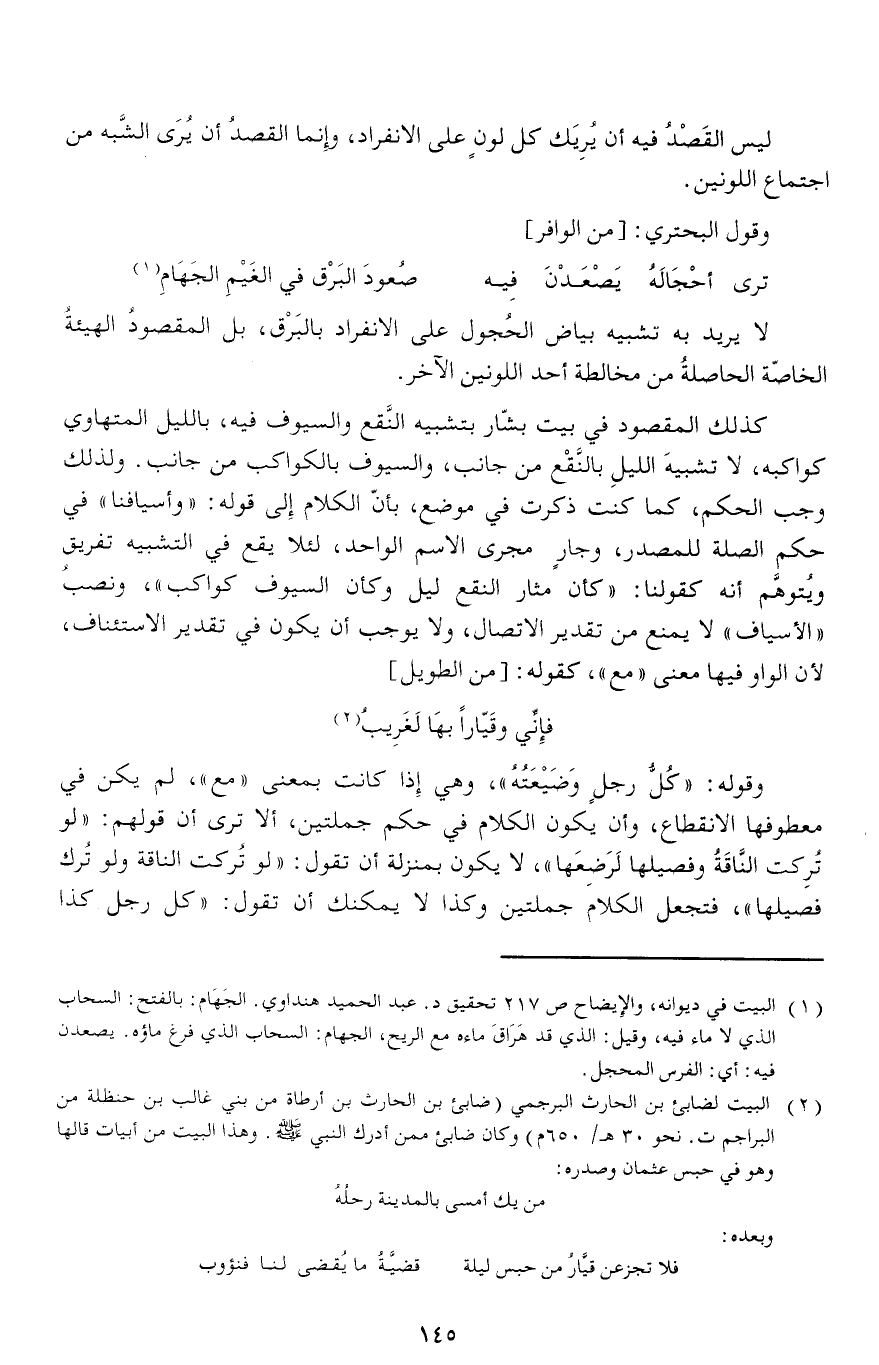 (¬1) البيت في ديوانه، والإيضاح ص 217 تحقيق د. عبد الحميد هنداوي. الجهام: بالفتح: السحاب الذي لا ماء فيه، وقيل: الذي قد هراق ماءه مع الريح، الجهام: السحاب الذي فرغ ماؤه. يصعدن فيه: أي: الفرس المحجل.