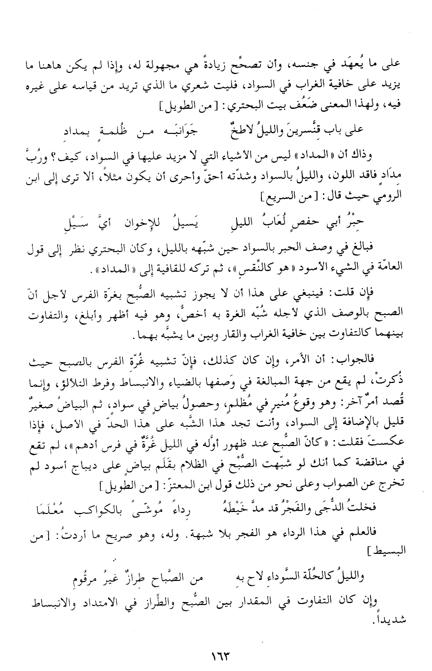 على ما يعهد في جنسه، وأن تصحّح زيادة هي مجهولة له، وإذا لم يكن هاهنا ما يزيد على خافية الغراب في السواد، فليت شعري ما الذي تريد من قياسه على غيره فيه، ولهذا المعنى ضعف بيت البحتري: [من الطويل]