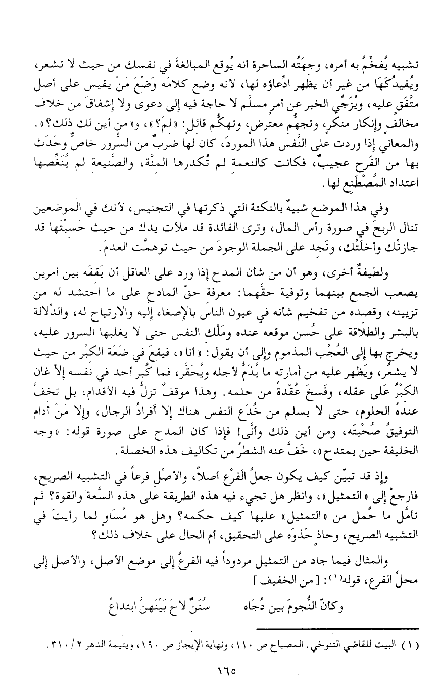 تشبيه يفخّم به أمره، وجهته الساحرة أنه يوقع المبالغة في نفسك من حيث لا تشعر، ويفيدكها من غير أن يظهر ادّعاؤه لها، لأنه وضع كلامه وضع من يقيس على أصل متّفق عليه، ويزجّي الخبر عن أمر مسلّم لا حاجة فيه إلى دعوى ولا إشفاق من خلاف مخالف وإنكار منكر، وتجهّم معترض، وتهكّم قائل: «لم؟»، و «من أين لك ذلك؟».