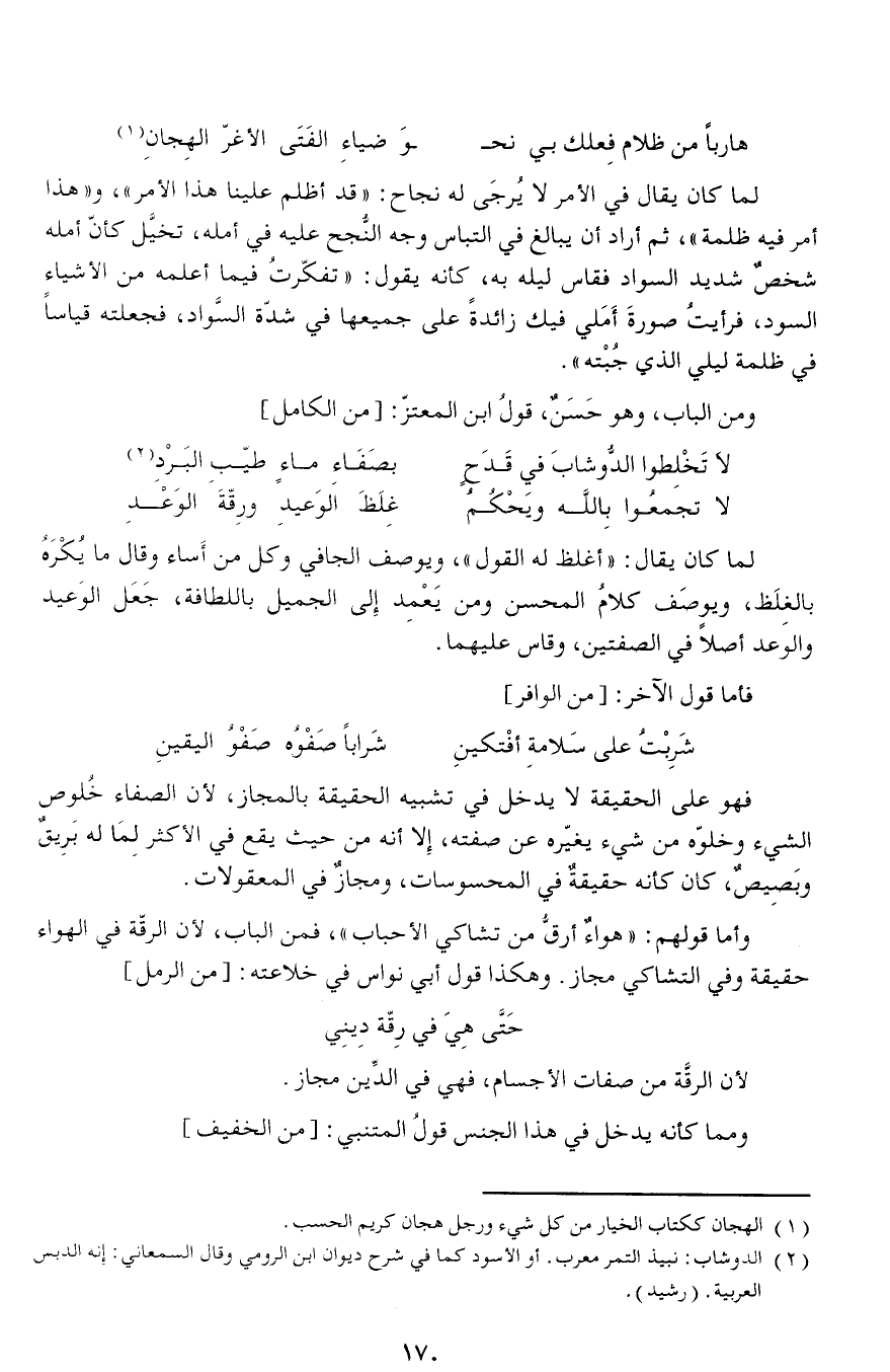 وأما قولهم: «هواء أرقّ من تشاكي الأحباب»، فمن الباب، لأن الرقّة في الهواء حقيقة وفي التشاكي مجاز. وهكذا قول أبي نواس في خلاعته: [من الرمل] حتّى هي في رقّة ديني لأن الرقّة من صفات الأجسام، فهي في الدّين مجاز.