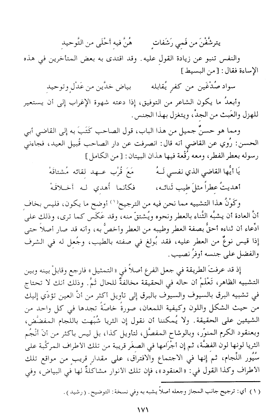 وكون هذا التشبيه مما نحن فيه من الترجيح (¬1) أوضح ما يكون، فليس بخاف أنّ العادة أن يشبّه الثّناء بالعطر ونحوه ويشتقّ منه، وقد عكس كما ترى، وذلك على ادّعاء أن ثناءه أحقّ بصفة العطر وطيبه من العطر وأخصّ به، وأنه قد صار أصلا حتى إذا قيس نوع من العطر عليه، فقد بولغ في صفته بالطيب، وجعل له في الشرف والفضل على جنسه أوفر نصيب.