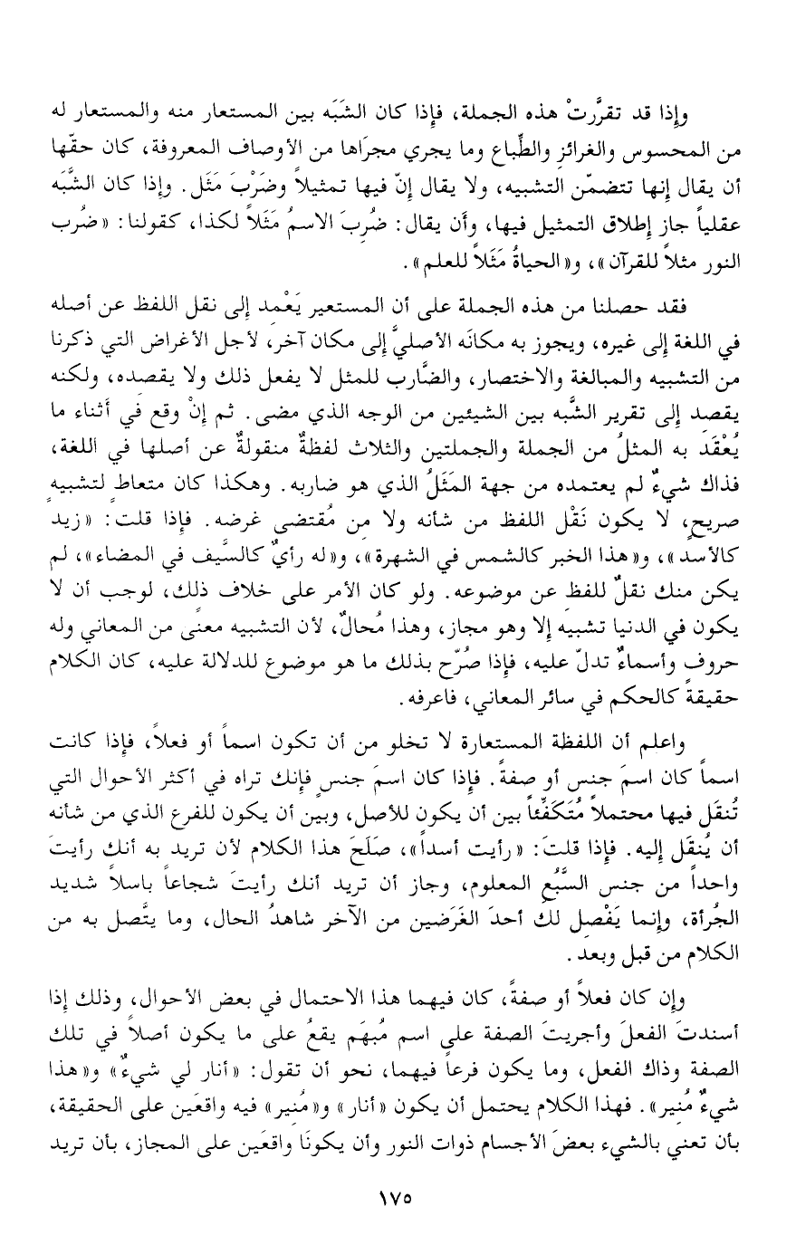 وإن كان فعلا أو صفة، كان فيهما هذا الاحتمال في بعض الأحوال، وذلك إذا أسندت الفعل وأجريت الصفة على اسم مبهم يقع على ما يكون أصلا في تلك الصفة وذاك الفعل، وما يكون فرعا فيهما، نحو أن تقول: «أنار لي شيء» و «هذا شيء منير». فهذا الكلام يحتمل أن يكون «أنار» و «منير» فيه واقعين على الحقيقة، بأن تعني بالشيء بعض الأجسام ذوات النور وأن يكونا واقعين على المجاز، بأن تريد