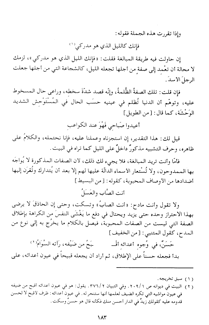فأمّا وأنت تريد المبالغة، فلا يجيء لك ذلك، لأن الصفات المذكورة لا يواجه بها الممدوحون، ولا تستعار الأسماء الدالّة عليها لهم إلا بعد أن يتدارك وتقرن إليها أضدادها من الأوصاف المحبوبة، كقوله: [من البسيط] أنت الصّاب والعسل ولا تقول وأنت مادح: «أنت الصاب» وتسكت، وحتى إن الحاذق لا يرضى بهذا الاحتراز وحده حتى يزيد ويحتال في دفع ما يغشى النفس من الكراهة بإطلاق الصفة التي ليست من الصفات المحبوبة، فيصل بالكلام ما يخرج به إلى نوع من المدح، كقول المتنبي: [من الخفيف]