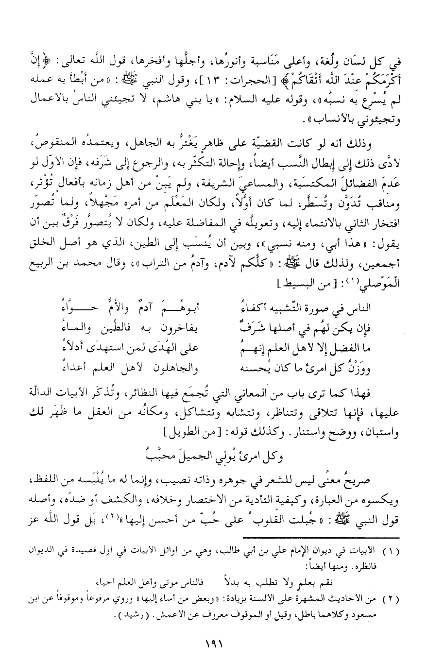 في كل لسان ولغة، وأعلى مناسبة وأنورها، وأجلّها وأفخرها، قول الله تعالى: إِنَّ أَكْرَمَكُمْ عِنْدَ اللَّهِ أَتْقاكُمْ [الحجرات: 13]، وقول النبي صلّى الله عليه وسلّم: «من أبطأ به عمله لم يسرع به نسبه»، وقوله عليه السلام: «يا بني هاشم، لا تجيئني الناس بالأعمال وتجيئوني بالأنساب».