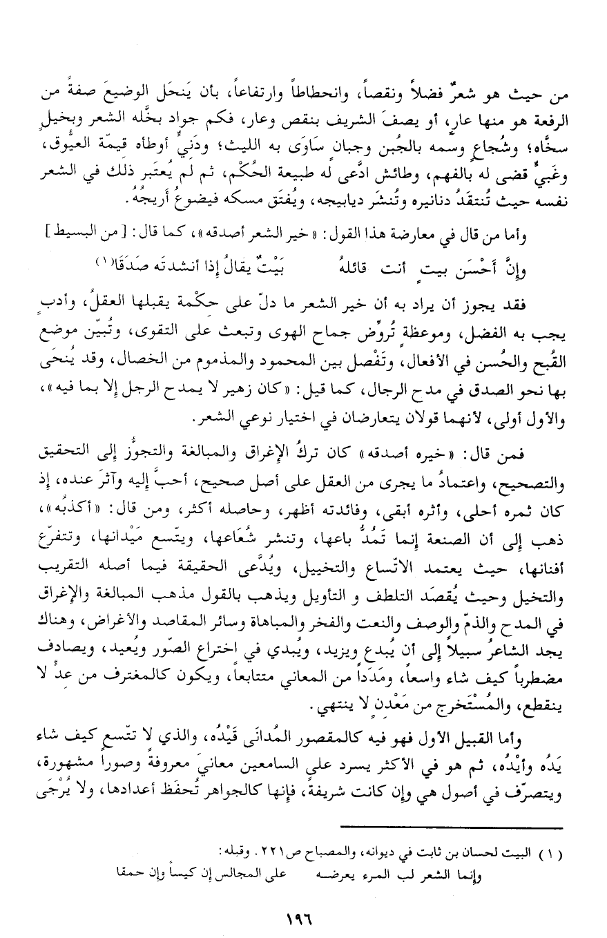 فمن قال: «خيره أصدقه» كان ترك الإغراق والمبالغة والتجوّز إلى التحقيق والتصحيح، واعتماد ما يجرى من العقل على أصل صحيح، أحبّ إليه وآثر عنده، إذ كان ثمره أحلى، وأثره أبقى، وفائدته أظهر، وحاصله أكثر، ومن قال: «أكذبه»، ذهب إلى أن الصنعة إنما تمدّ باعها، وتنشر شعاعها، ويتّسع ميدانها، وتتفرّع أفنانها، حيث يعتمد الاتّساع والتخييل، ويدّعى الحقيقة فيما أصله التقريب والتخيل وحيث يقصد التلطف والتأويل ويذهب بالقول مذهب المبالغة والإغراق في المدح والذمّ والوصف والنعت والفخر والمباهاة وسائر المقاصد والأغراض، وهناك يجد الشاعر سبيلا إلى أن يبدع ويزيد، ويبدي في اختراع الصّور ويعيد، ويصادف مضطربا كيف شاء واسعا، ومددا من المعاني متتابعا، ويكون كالمغترف من عدّ لا ينقطع، والمستخرج من معدن لا ينتهي.