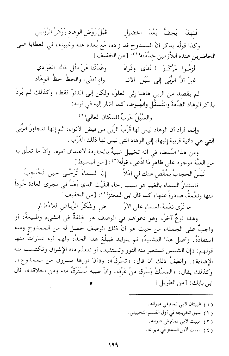 وهذا نوع آخر، وهو دعواهم في الوصف هو خلقة في الشيء وطبيعة، أو واجب على الجملة، من حيث هو أنّ ذلك الوصف حصل له من الممدوح ومنه استفاده. وأصل هذا التشبيه، ثم يتزايد فيبلغ هذا الحدّ، ولهم فيه عبارات منها قولهم: «إن الشمس تستعير منه النور وتستفيد، أو تتعلّم منه الإشراق وتكتسب منه الإضاءة». وألطف ذلك أن قال: «تسرق»، و «أن نورها مسروق من الممدوح».