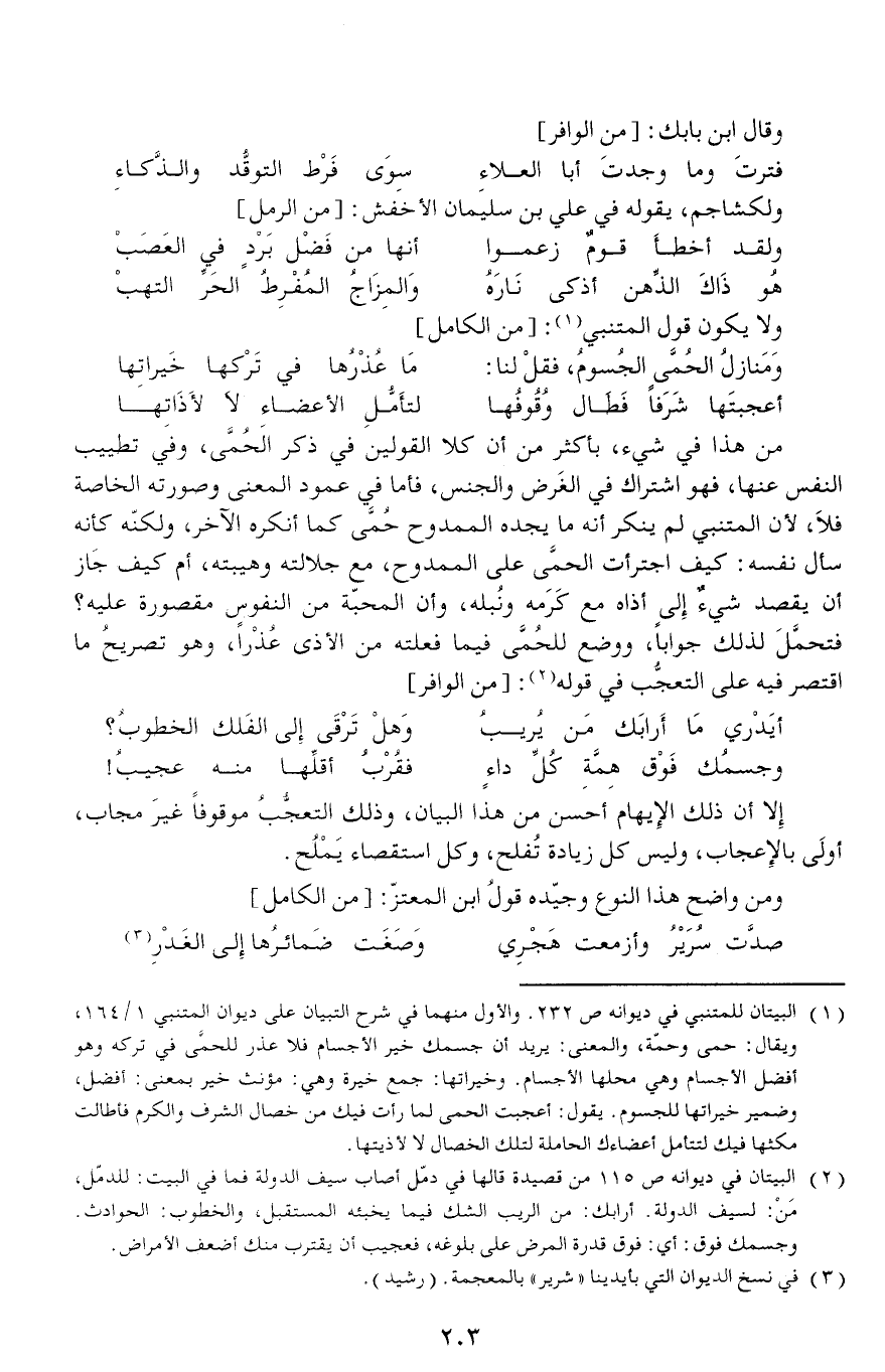 (¬1) البيتان للمتنبي في ديوانه ص 232. والأول منهما في شرح التبيان على ديوان المتنبي 1/ 164، ويقال: حمى وحمّة، والمعنى: يريد أن جسمك خير الأجسام فلا عذر للحمّى في تركه وهو أفضل الأجسام وهي محلها الأجسام. وخيراتها: جمع خيرة وهي: مؤنث خير بمعنى: أفضل، وضمير خيراتها للجسوم. يقول: أعجبت الحمى لما رأت فيك من خصال الشرف والكرم فأطالت مكثها فيك لتتأمل أعضاءك الحاملة لتلك الخصال لا لأذيتها.