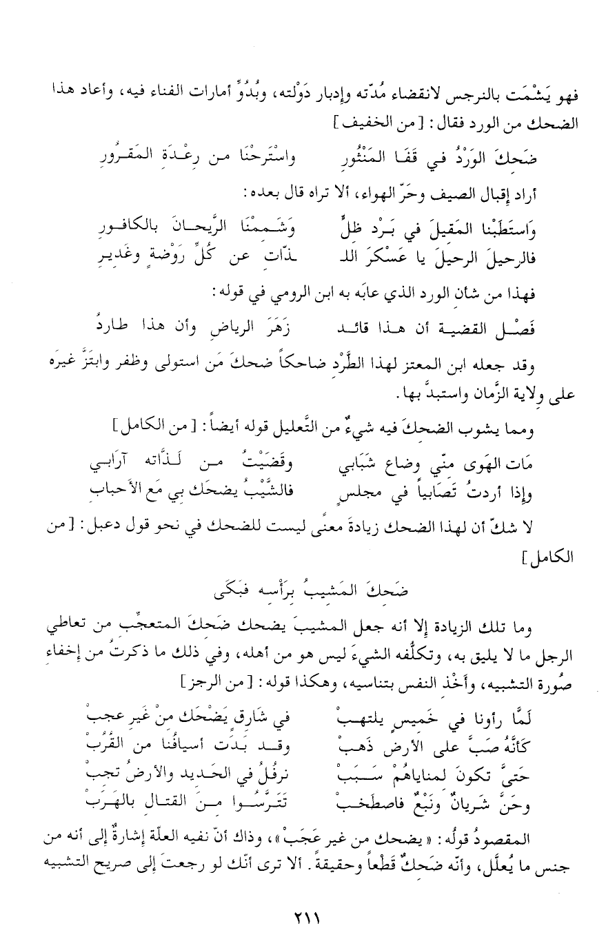لا شكّ أن لهذا الضحك زيادة معنى ليست للضحك في نحو قول دعبل: [من الكامل] ضحك المشيب برأسه فبكى وما تلك الزيادة إلا أنه جعل المشيب يضحك ضحك المتعجّب من تعاطي الرجل ما لا يليق به، وتكلّفه الشيء ليس هو من أهله، وفي ذلك ما ذكرت من إخفاء صورة التشبيه، وأخذ النفس بتناسيه، وهكذا قوله: [من الرجز]