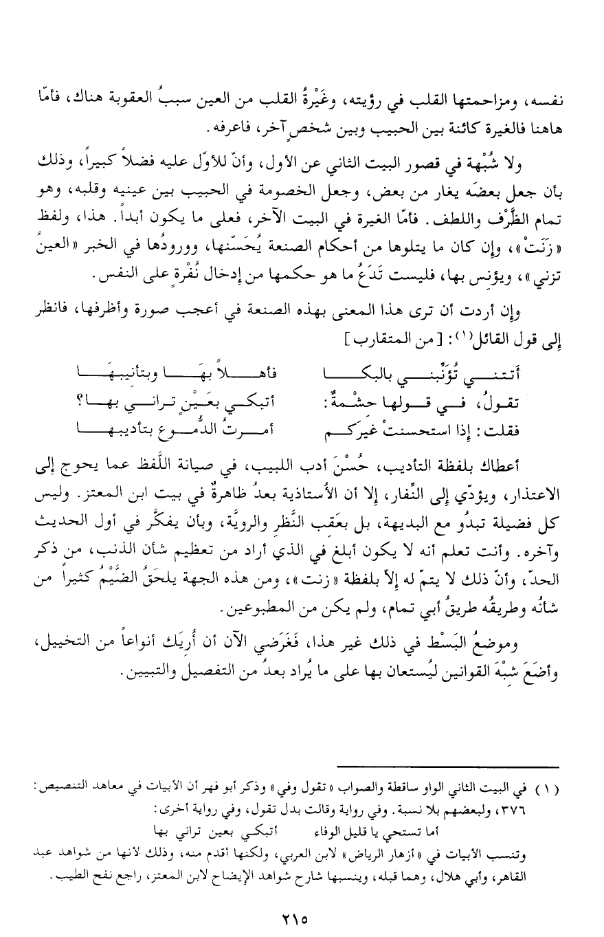 أعطاك بلفظة التأديب، حسن أدب اللبيب، في صيانة اللّفظ عما يحوج إلى الاعتذار، ويؤدّي إلى النّفار، إلا أن الأستاذية بعد ظاهرة في بيت ابن المعتز. وليس كل فضيلة تبدو مع البديهة، بل بعقب النّظر والرويّة، وبأن يفكّر في أول الحديث وآخره. وأنت تعلم أنه لا يكون أبلغ في الذي أراد من تعظيم شأن الذنب، من ذكر الحدّ، وأنّ ذلك لا يتمّ له إلّا بلفظة «زنت»، ومن هذه الجهة يلحق الضّيم كثيرا من شأنه وطريقه طريق أبي تمام، ولم يكن من المطبوعين.