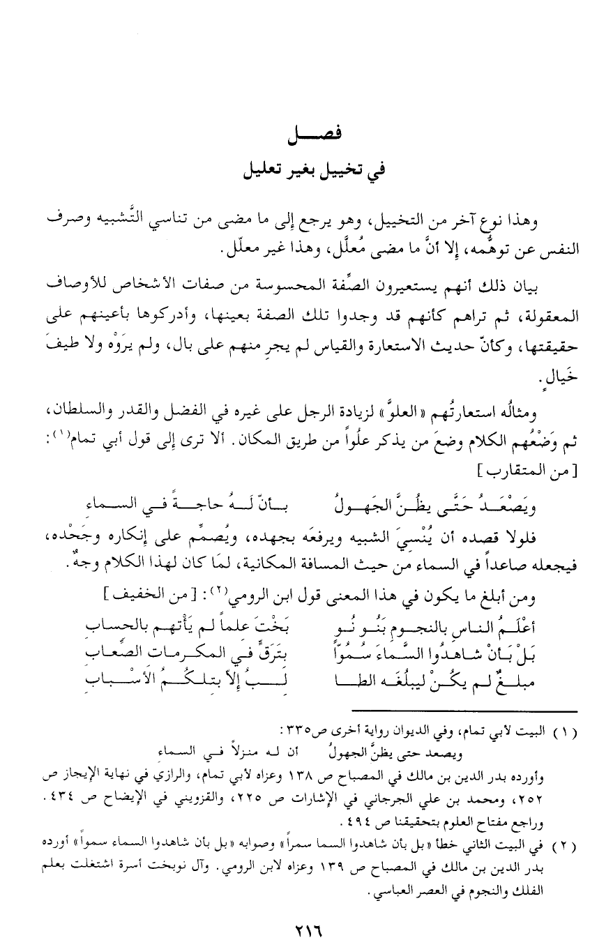 ومثاله استعارتهم «العلوّ» لزيادة الرجل على غيره في الفضل والقدر والسلطان، ثم وضعهم الكلام وضع من يذكر علوا من طريق المكان. ألا ترى إلى قول أبي تمام (¬1):