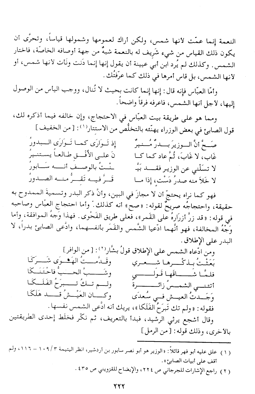 فهو كما نراه يحتجّ أن لا مجاز في البين، وأنّ ذكر البدر وتسمية الممدوح به حقيقة، واحتجاجه صريح لقوله: «صح» أنه كذلك. وأما احتجاج العبّاس وصاحبه في قوله: «قد زرّ أزراره على القمر»، فعلى طريق الفحوى. فهذا وجه الموافقة، وأما وجه المخالفة، فهو أنّهما ادّعيا الشّمس والقمر بأنفسهما، وادّعى الصابئ بدرا، لا البدر على الإطلاق.