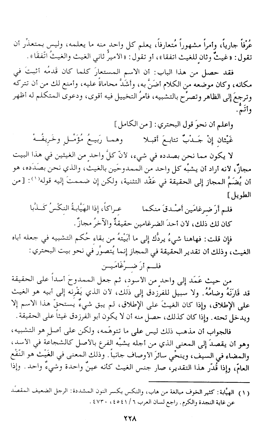 فلم أر ضرغامين من حيث عمد إلى واحد من الأسود، ثم جعل الممدوح أسدا على الحقيقة قد قارنه وضامّه. ولا سبيل للفرزدق إلى ذلك، لأن الذي يقرنه إلى أبيه هو الغيث على الإطلاق، وإذا كان الغيث على الإطلاق، لم يبق شيء يستحقّ هذا الاسم إلا ويدخل تحته. وإذا كان كذلك، حصل منه أن لا يكون أبو الفرزدق غيثا على الحقيقة.