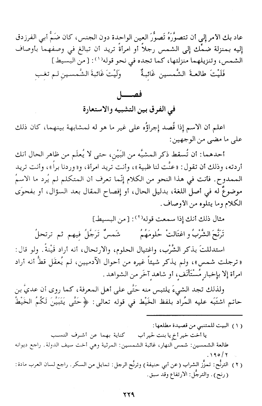 عاد بك الأمر إلى أن تتصوّره تصوّر العين الواحدة دون الجنس، كان ضمّ أبي الفرزدق إليه بمنزلة ضمّك إلى الشمس رجلا أو امرأة تريد أن تبالغ في وصفهما بأوصاف الشمس، وتنزيلهما منزلتها، كما تجده في نحو قوله (¬1): [من البسيط]