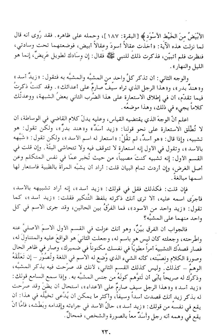 والوجه الثاني: أن تذكر كلّ واحد من المشبّه والمشبّه به فتقول: «زيد أسد» و «هند بدر»، و «هذا الرجل الذي تراه سيف صارم على أعدائك». وقد كنت ذكرت فيما تقدّم، أن في إطلاق الاستعارة على هذا الضّرب الثاني بعض الشبهة، ووعدتك كلاما يجيء في ذلك، وهذا موضعه.