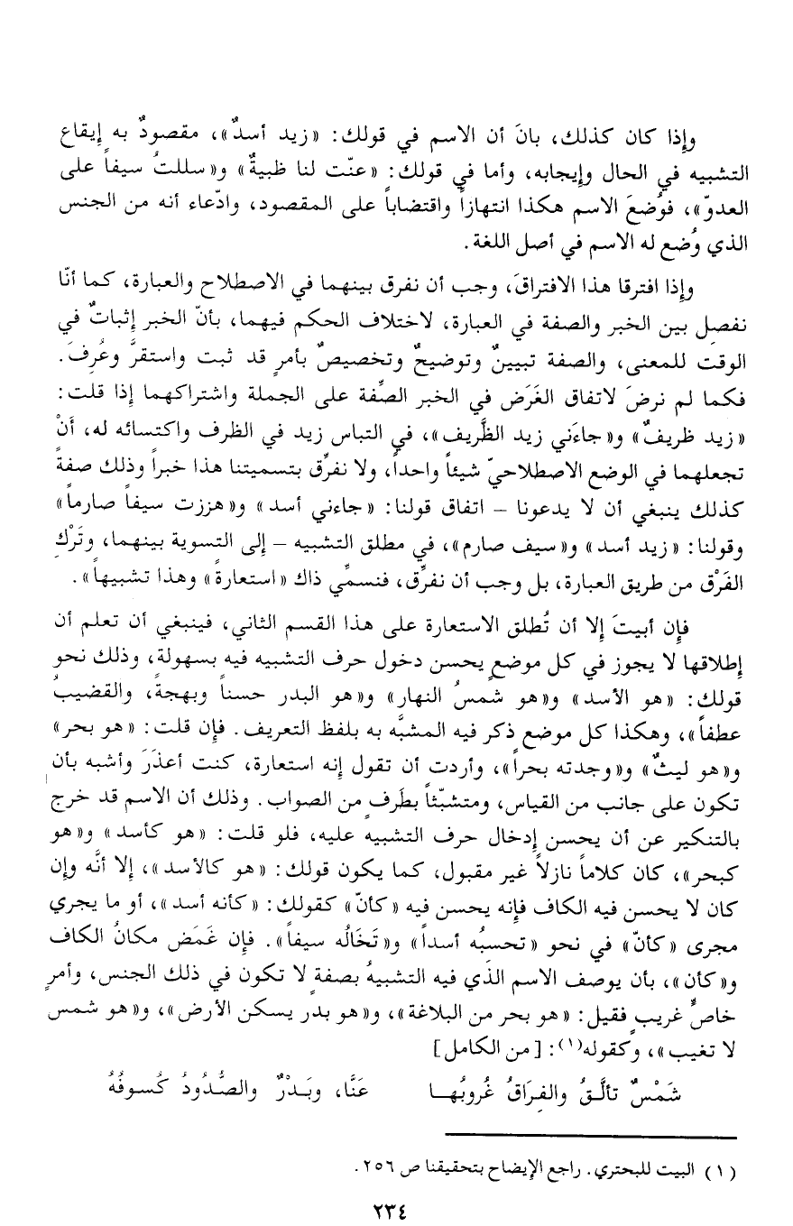 «زيد ظريف» و «جاءني زيد الظّريف»، في التباس زيد في الظرف واكتسائه له، أن تجعلهما في الوضع الاصطلاحيّ شيئا واحدا، ولا نفرّق بتسميتنا هذا خبرا وذلك صفة كذلك ينبغي أن لا يدعونا- اتفاق قولنا: «جاءني أسد» و «هززت سيفا صارما» وقولنا: «زيد أسد» و «سيف صارم»، في مطلق التشبيه- إلى التسوية بينهما، وترك الفرق من طريق العبارة، بل وجب أن نفرّق، فنسمّي ذاك «الاستعارة» وهذا تشبيها».